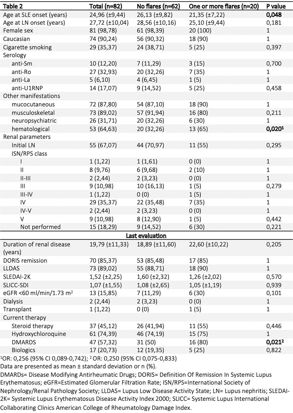 Comparing patients with renal disease exacerbations and those without renal flares, the former group was younger at SLE onset (p=0,048) and exhibited more hematological manifestations. No differences were observed in renal function, disease activity (SLEDAI-2K), or organ damage (SLICC-SDI). However, there was a notable distinction in maintenance therapy, with a greater use of disease-modifying antirheumatic drugs (DMARDS) in patients experiencing one or more disease flares (p=0.021).