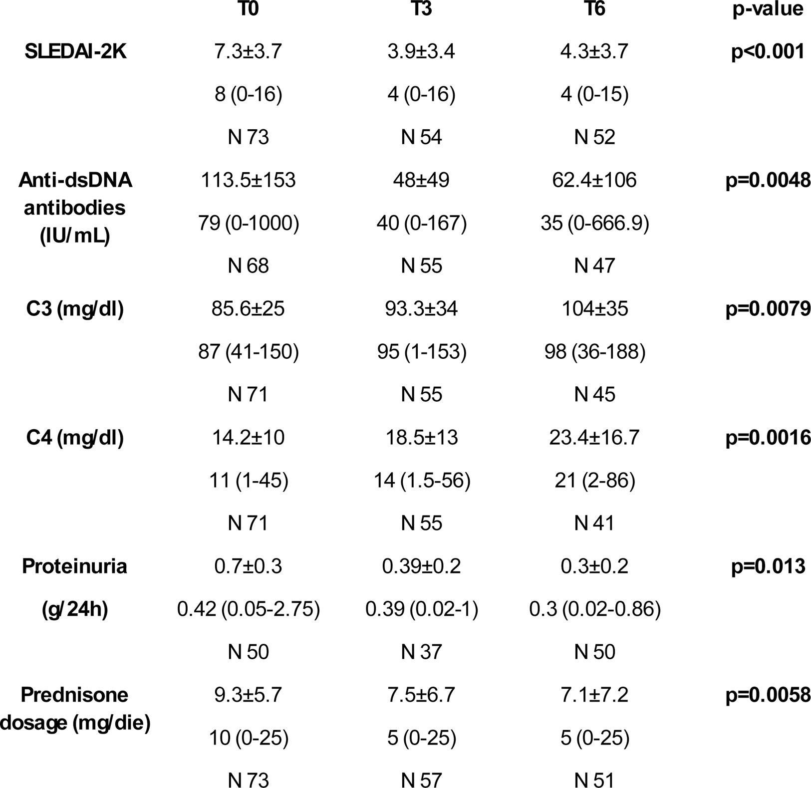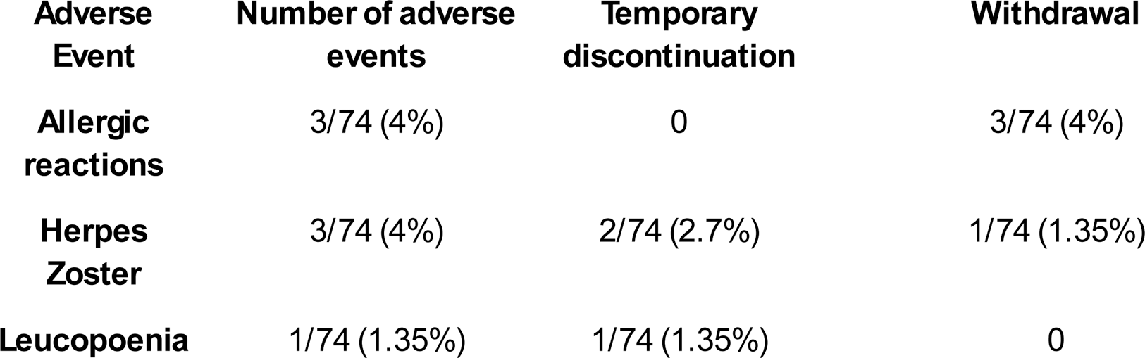 Clinical features at T0, T3 and T6 are summarised in Table 1. The data have confirmed a significant reduction of SLEDAI-2K, C3 and C4, anti-dsDNA antibodies, proteinuria and prednisone dosage from the first months of treatment. No significant differences were found regarding ESR, CRP, haemoglobin and creatinine. Adverse events are summarised in the Table 2.