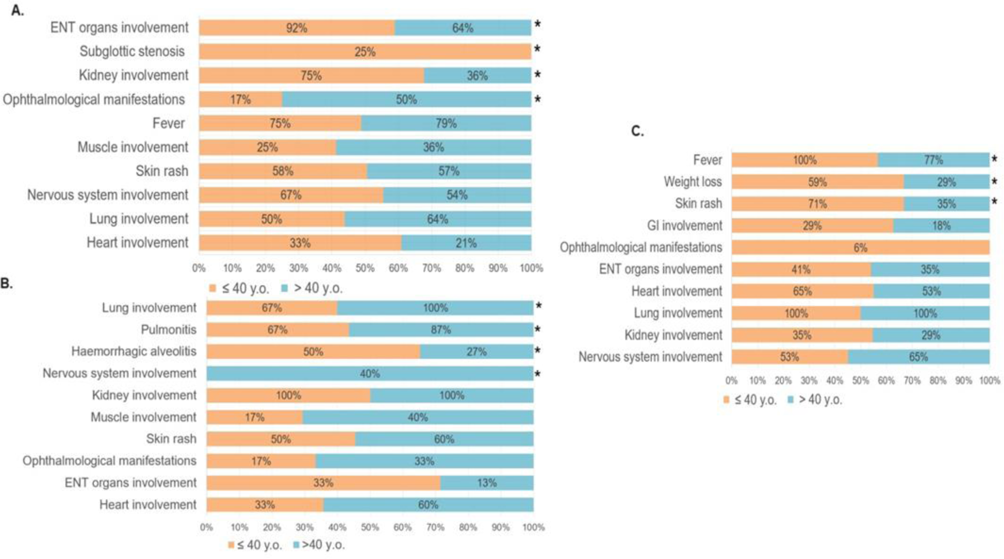 Clinical characteristics of patients with GPA (A), MPA (B) and EGPA (C) according to age groups.