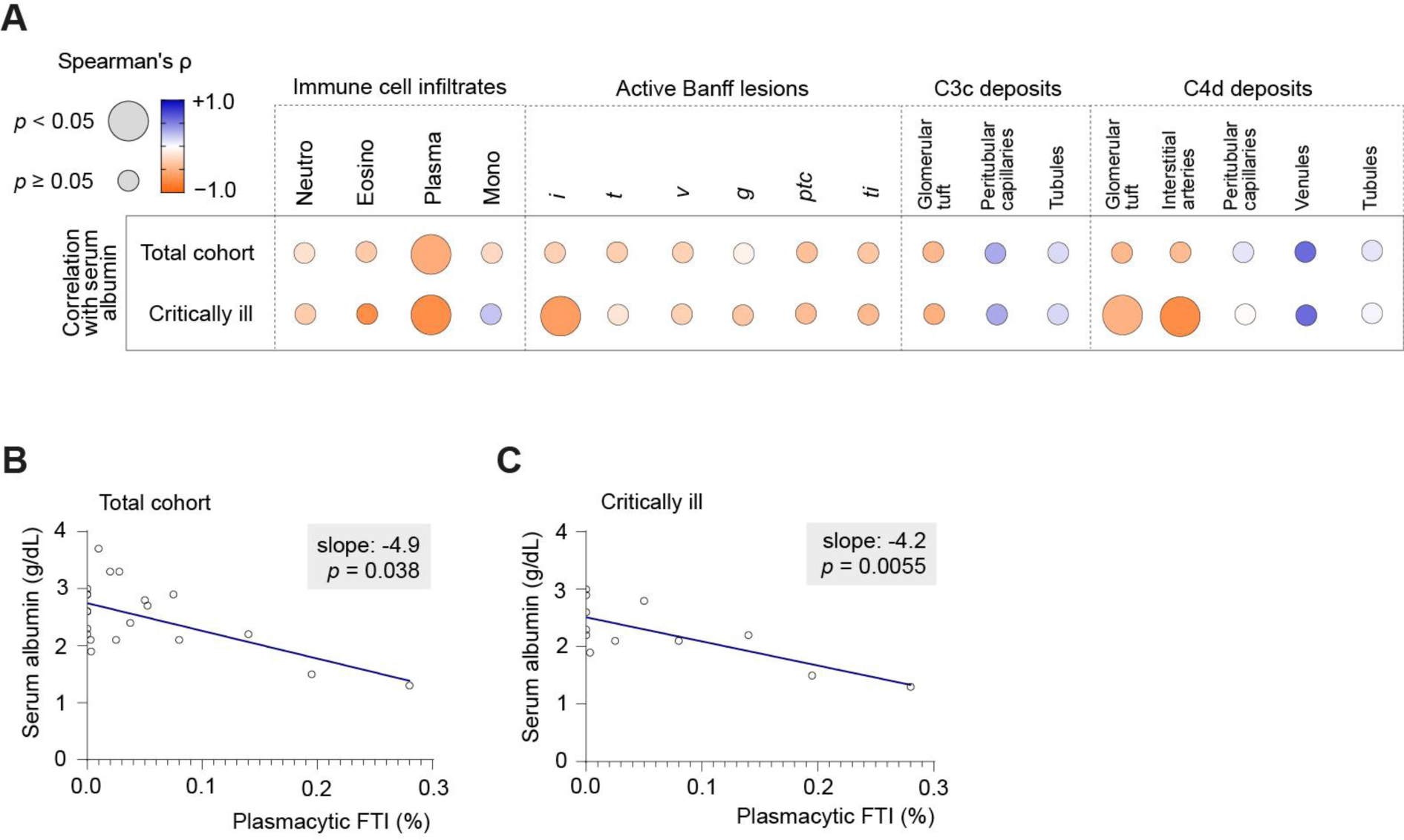 Results: We here show that hypoalbuminemia below the median of 2.4 g/dL impairs long-term renal survival especially in MPO-positive ANCA-associated renal vasculitis ( p = 0.006, HR: 5.0, 95% CI: 1.2-21.5), while short-term clinical recovery particularly in critically ill patients is negatively affected by low serum albumin levels ( p=0.0082 , HR: 3.6, 95% CI: 1.1-11.7). Low albumin levels are associated with the urinary marker of tubular damage in the total cohort ( β = -0.5, p = 0.01), PR3-ANCA ( β = -0.5, p = 0.04) and MPO-ANCA ( p = 0.002, β = -0.8), but not in critically ill patients ( β = -0.5, p = 0.07) implying hypoalbuminemia to occur by extrarenal causation in the state of critical illness. We identified plasmacytic infiltrates to correlate with low albumin levels in the total cohort ( β = -0.6, p = 0.004) and in the subgroup of critically ill patients ( β = -0.7, p = 0.005). Banff-scored interstitial inflammation ( i ) was further observed to inversely correlate with albumin levels ( β = -0.7, p = 0.02). Intrarenal C4d deposition showed a significant correlation with low serum albumin levels in the glomerular tuft ( β = -0.4, p = 0.04) and in interstitial arteries ( β = -0.7, p = 0.01).