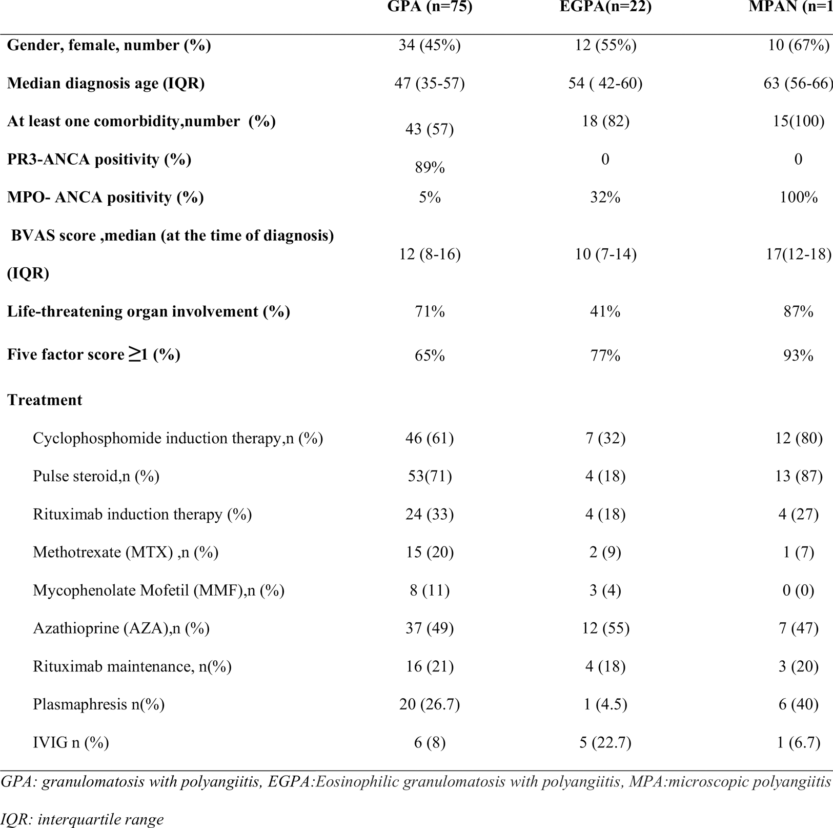 Results: 112 ANCA vasculitis patients, consists of GPA 75 (67%), EGPA 22(19.6%), MPAN 15 (13.4 %), were included in the study. Median age of total cohort was 55 (Min: 18 - Max: 86]). Patients characteristics were summarized in Table 1.