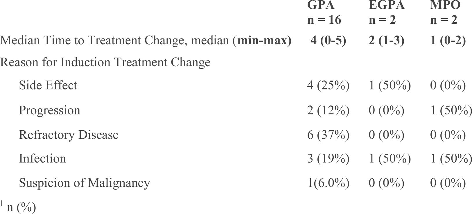 Changes in treatment during the remission induction phase occurred in 21.3% of GPA patients, 9% of EGPA patients, and 13% of MPAN patients. The median time to treatment modification was 4 month (min max 0-5) for GPA patients, 2months (min-max 1-3) for EGPA patients, and 1 month (min-max 0-2) for MPAN patients. The primary reasons for treatment modification are summarized in Table 2. Side effects identified were cytopenia and liver function test abnormalities.