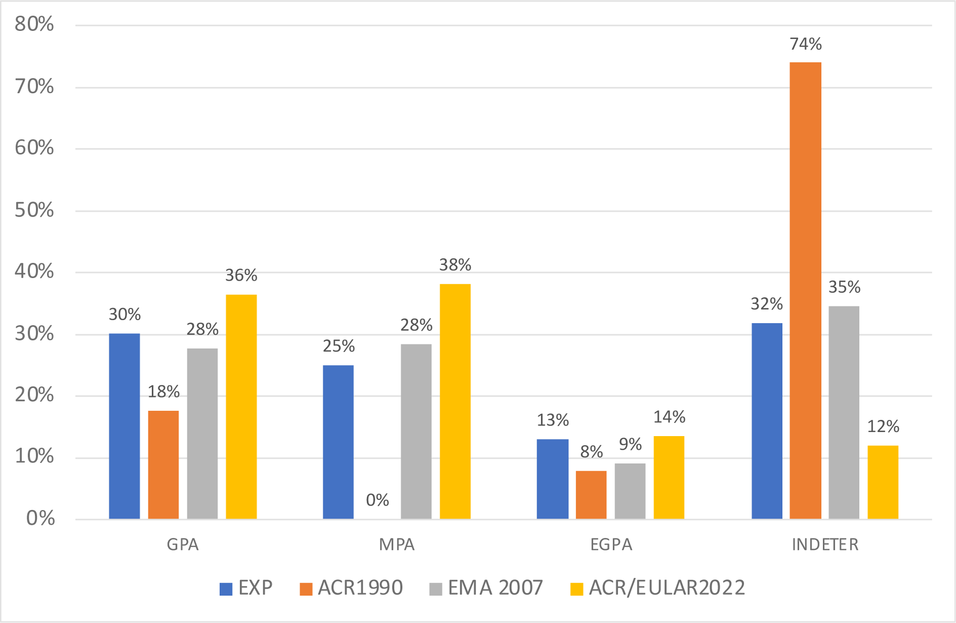 Differences between expert clinical opinion (EXP), ACR 1990, EMA 2007 and ACR/EULAR 2022 criteria.