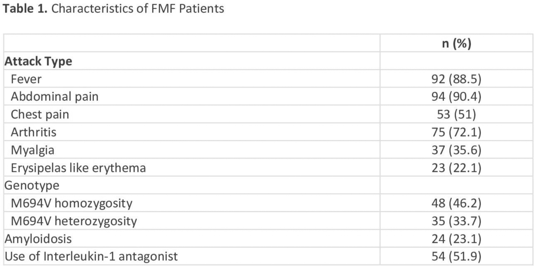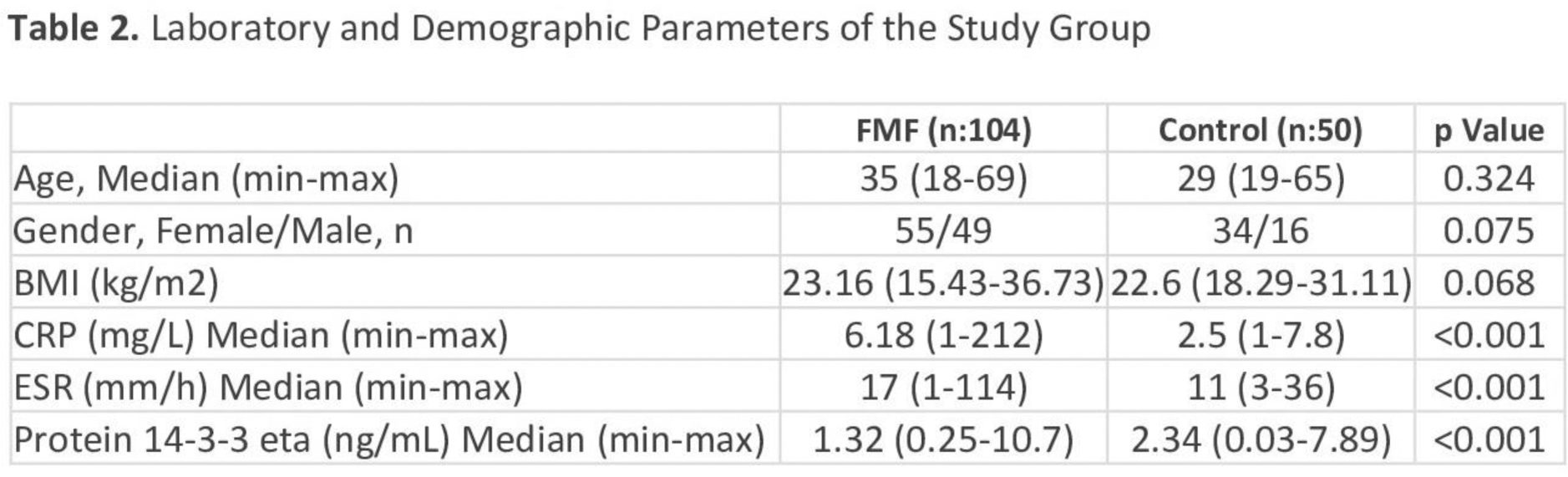 Methods: The study included 104 FMF patients and 50 healthy controls. Serum protein 14-3-3 eta levels from peripheral blood samples were analysed by ELISA method using ELK Biotechnology kit (China).