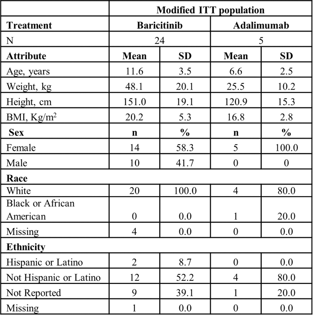 Results: Among patients receiving baricitinib (N=24) the mean age was 11.6 (standard deviation [SD]: 3.5), 58.3% were female and the vast majority were White (Table 1). In the adalimumab group, the mean age was 6.6 years (SD: 2.5), 100% were female, and 80% were White (Table 1).