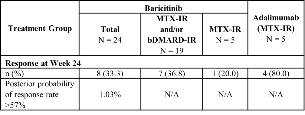The primary endpoint of the study was not met. In the baricitinib group, 33% of patients achieved a response at W24, resulting in 1.03% posterior probability of a response rate of >57% (Table 2). The safety data, including the observed TEAEs in baricitinib treated patients with JIA-U and ANA-positive uveitis were consistent with the established safety profile in other baricitinib indications in paediatric and adult patients. In the baricitinib group, 83.3% of patients were reported with at least 1 TEAE of which 41.7% were mild, 29.2% were moderate and 12.5% were severe.