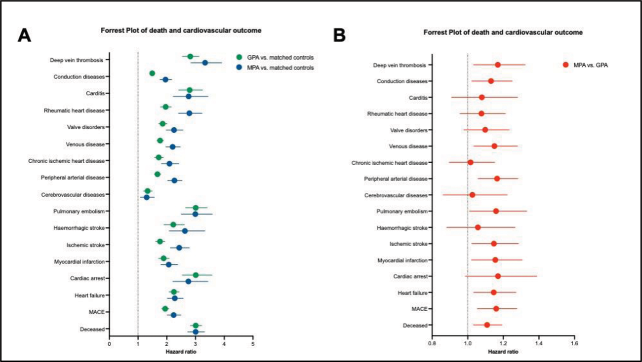 Forest plot based on hazard ratios of death and all cardiovascular outcomes. A: Elevated risk of death and cardiovascular events in GPA (green) and MPA (blue) compared to matched controls; B: Comparison of risks for MACE and peripheral arterial disease between MPA and GPA ( P = 0.0023).