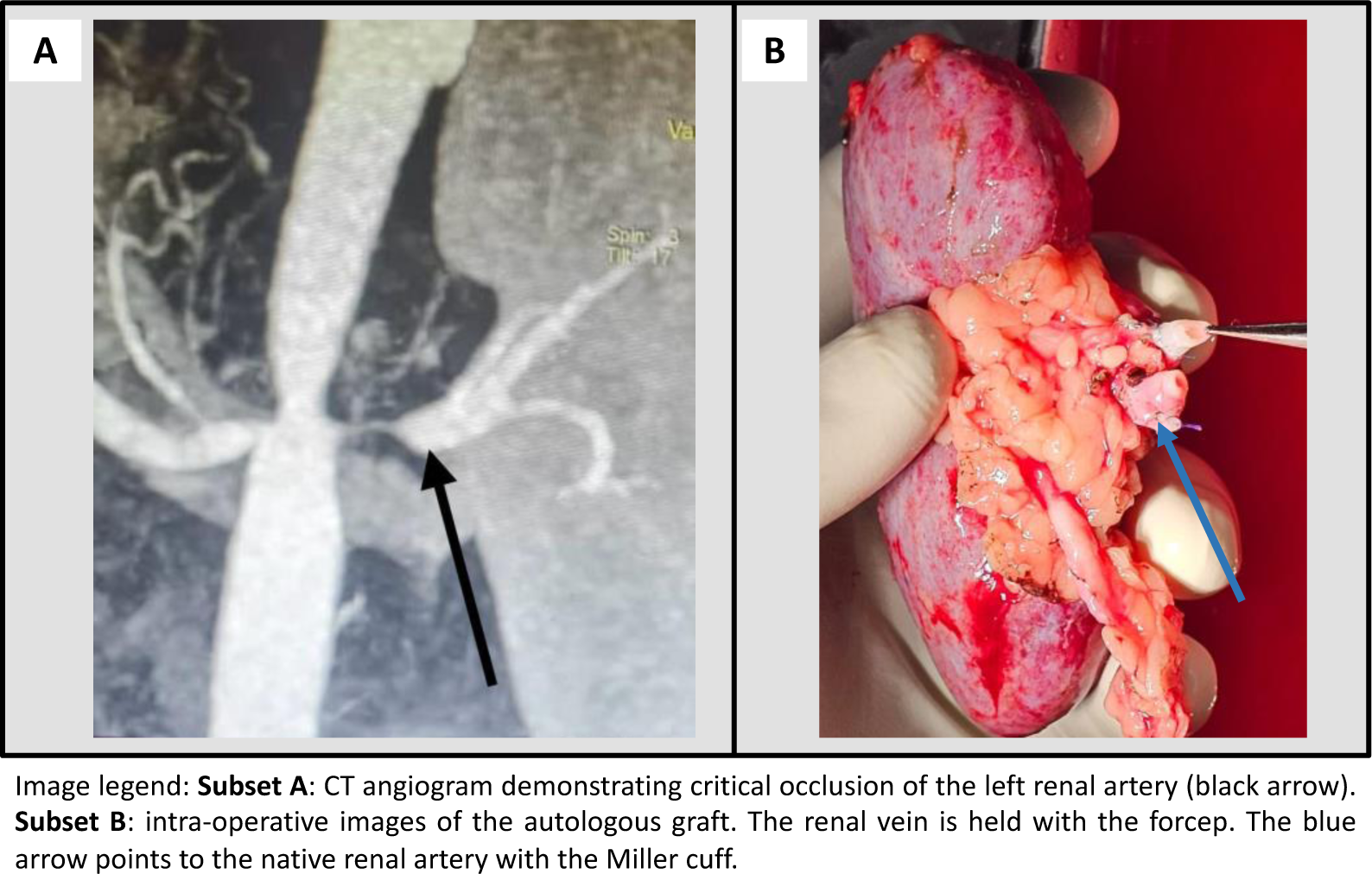 Case presentation: A 29-year-old Sri Lankan female with TA and resistant hypertension was found to have 90% and 25% luminal obstruction in the left and right renal arteries respectively (Figure 1: subset A). Despite treatment with prazosin 5.5mg thrice daily, cilnidipine 10 mg daily, methyldopa 500mg thrice daily, metoprolol 50mg twice daily, and spironolactone 50mg once daily, her blood pressure was persistently higher than 180/90 mmHg in the right arm. She was on prednisolone 60mg and azathioprine 100mg daily. Her renal functions and the DTPA scan were normal. She did not tolerate renin-aldosterone inhibitors. Stenting of the left renal artery was failed. She underwent an autologous left renal transplant to the right internal iliac artery using a Miller cuff (Figure 1: subset B). She was treated with IV tocilizumab to reduce vascular friability, preoperatively. After surgery, her blood pressure was controlled with metoprolol 25mg twice daily and cilnidipine 10mg daily alone.