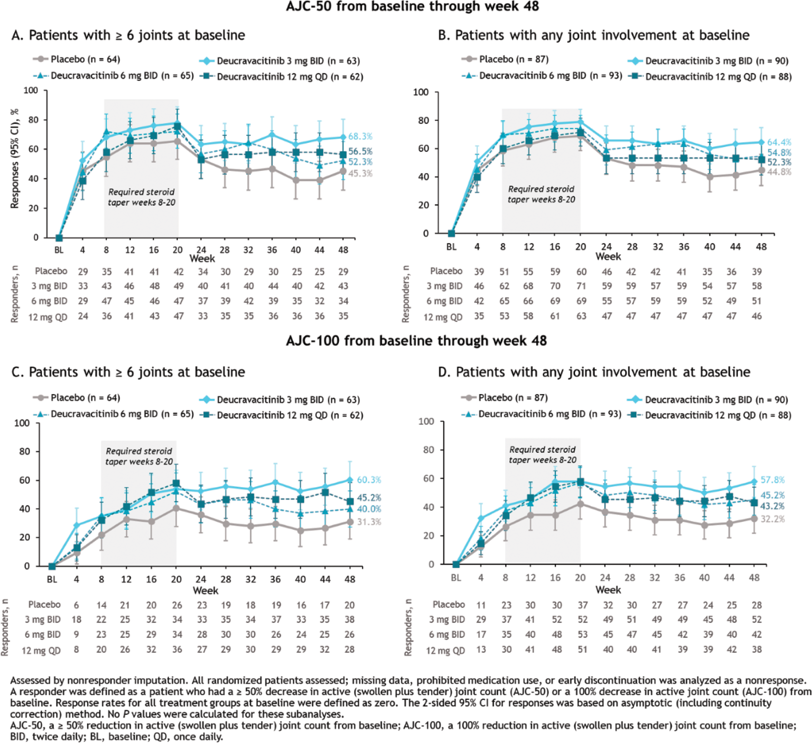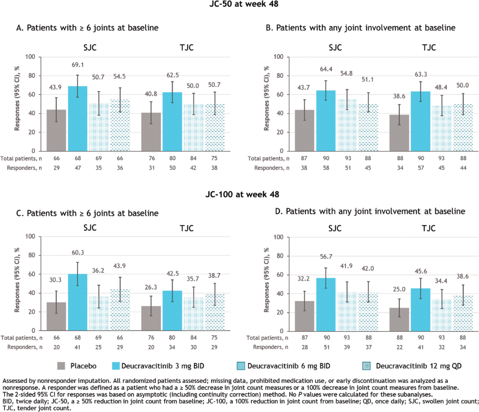 Results: At week 32 (primary endpoint analysis time point), more patients with ≥ 6 active joints at baseline receiving deucravacitinib achieved AJC-50 vs those receiving placebo (placebo, 45.3%; deucravacitinib 3 mg BID, 63.5%; 6 mg BID, 64.6%; 12 mg QD, 56.5%; Figure 1A), in line with previously reported JC-50 findings at week 48. Patients with any joint involvement at baseline receiving deucravacitinib achieved AJC-50 more often than those receiving placebo (week 32: placebo, 48.3%; deucravacitinib 3 mg BID, 63.3%; 6 mg BID, 63.4%; 12 mg QD, 53.4%) through week 48 (Figure 1B). AJC-100 results were similar to AJC-50 results in both populations through week 48 (Figures 1C and 1D). Consistent patterns of higher JC-50 and JC-100 responses with deucravacitinib were observed in separate analyses of SJC and TJC through week 48 (Figure 2).