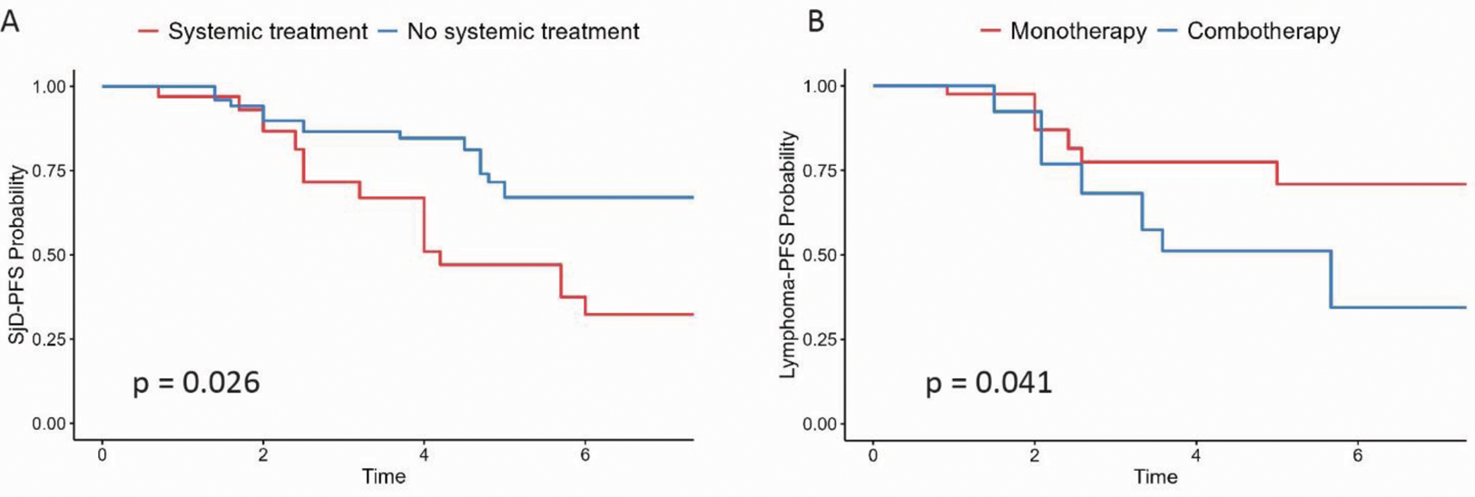 A) Probability of Sjögren progression free survival according to systemic treatment vs no systemic treatment at lymphoma diagnosis, after propensity score adjustment. B) Probability of Lymphoma-PFS according to combotherapy vs monotherapy, after propensity score adjustment.
