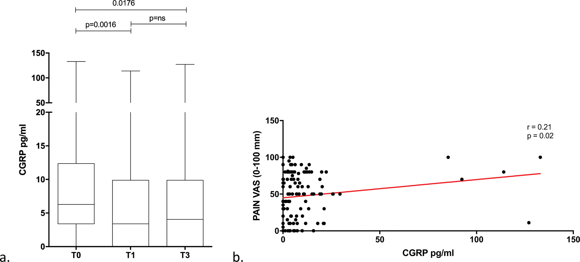 a. Reduction of serum CGRP in patients treated with baricitinib, from baseline (T0) and after 1 and 3 months of treatment (T1, T3). b. correlation between levels of pain and serum CGRP.