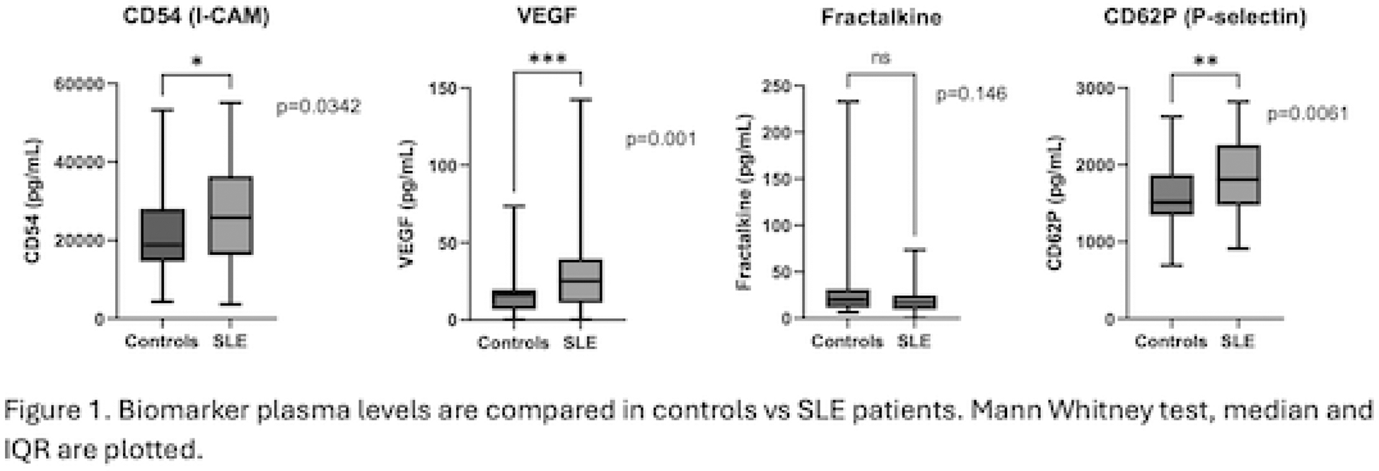 Methods: A cross-sectional study was conducted in which plasma levels of VEGF, CD54, CD62P, and fractalkine were compared between SLE patients and healthy controls (HC). Clinical and analytical variables were measured, and biomarkers were correlated with disease activity and the Systemic Damage Index (SDI). Biomarkers were measured by flow cytometry using a cytometric bead array (CBA-BD).