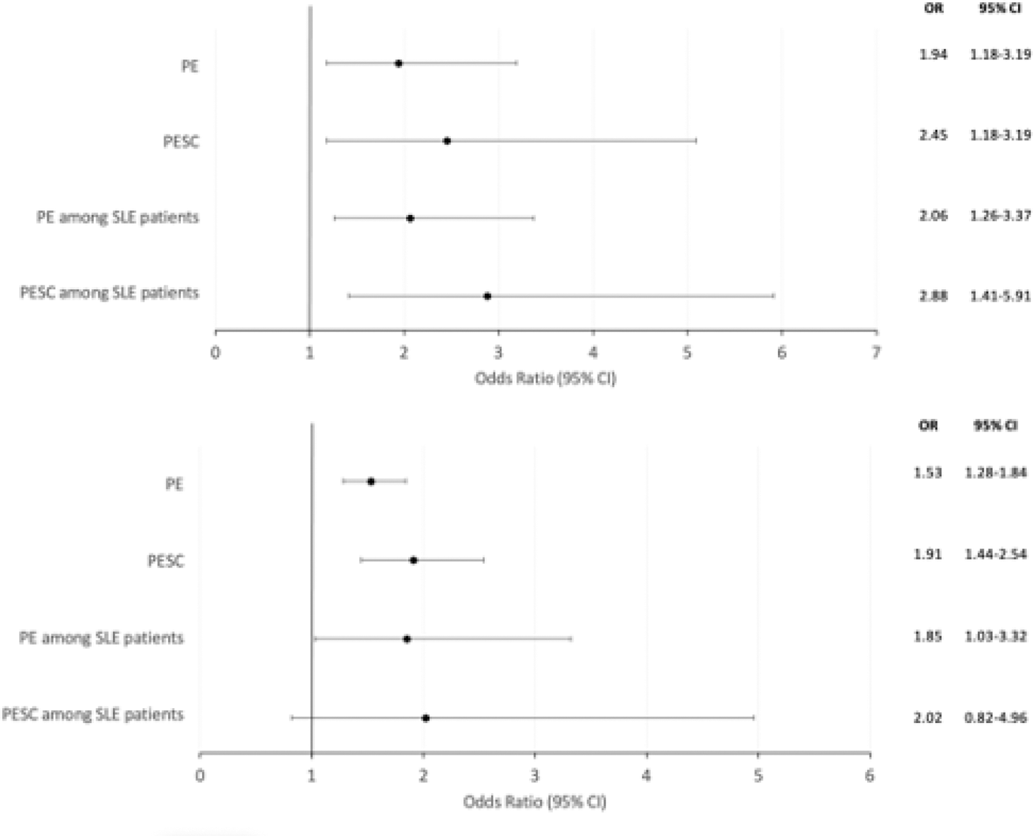 Objectives: To evaluate the impact of APS and SLE, with a particular focus on LN, on the risk of developing PE and PE with severity criteria.