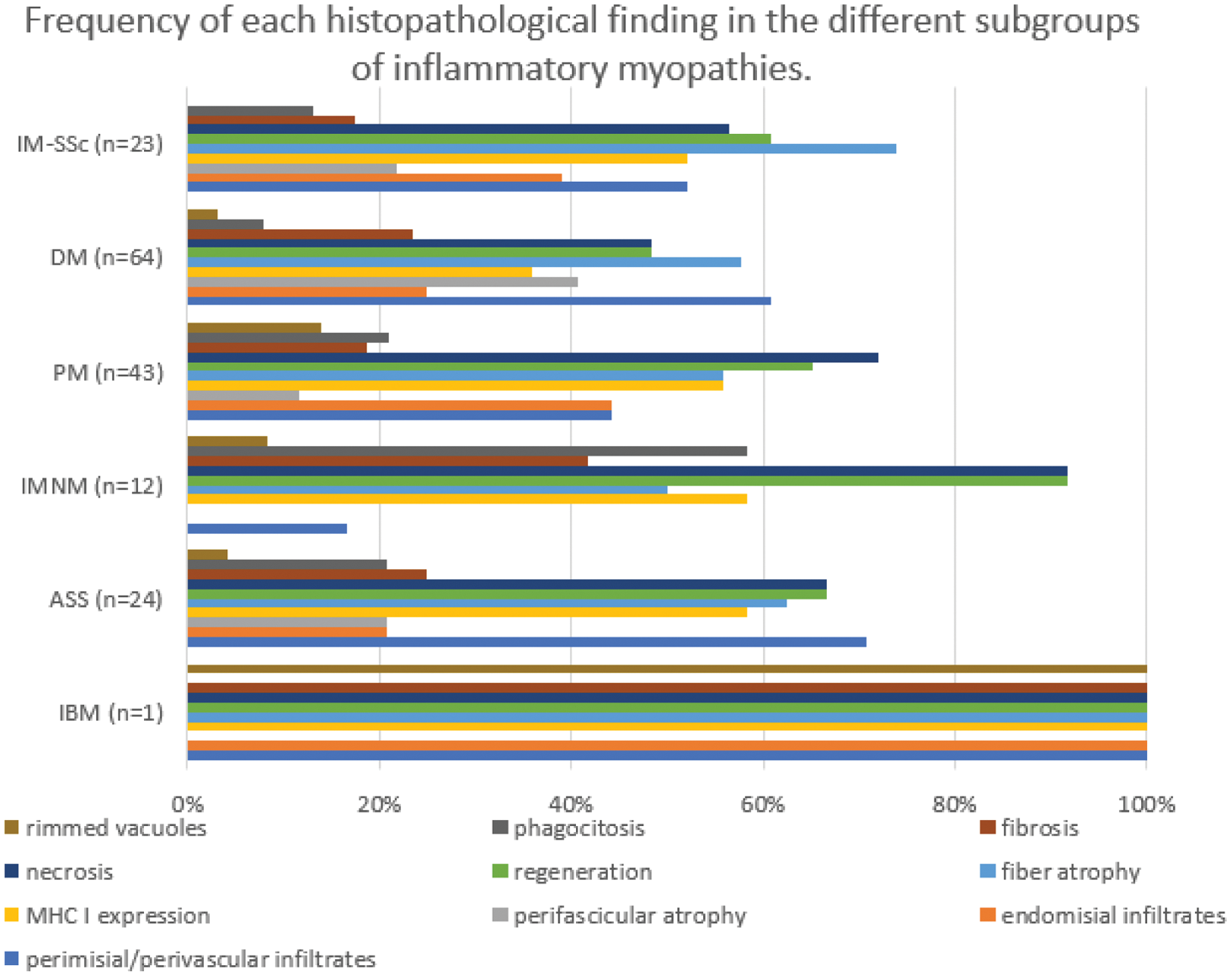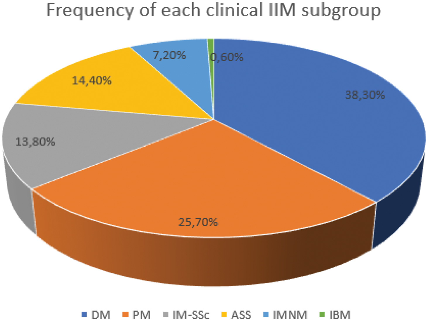 DM: dermatomyositis, PM: polimyositis; IIM-SSc: idiopathic inflammatory myopathy associated to systemic sclerosis; ASS: antisynthetase syndrome; IMNM: immunomediated necrotizing myopathy; IBM: inclusion body myositis