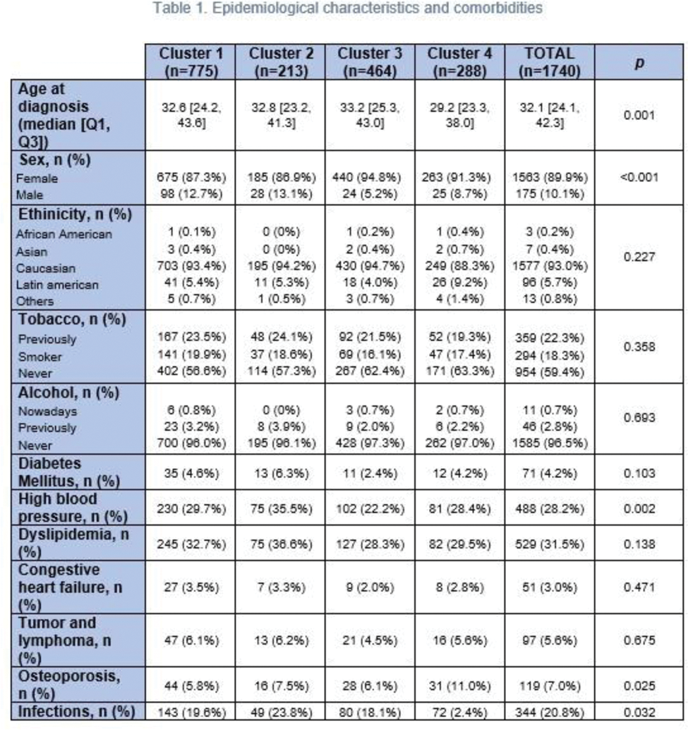 Objectives: The aim of this study is to define and describe serological clusters and their clinical and epidemiological characteristics, as well as their association with comorbidities, disease activity, severity and damage.