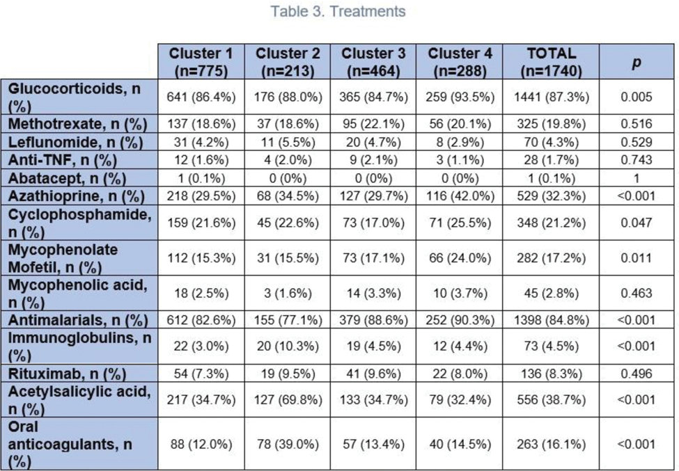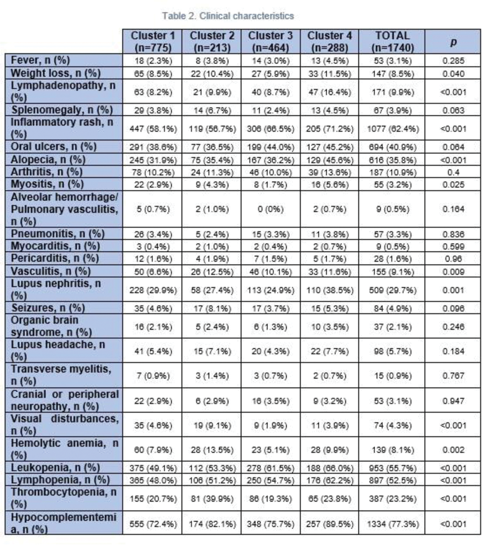 Results: Four serological clusters were defined. Cluster 1 (absence of anti-extractable nuclear antigen antibodies; 44.54% of the patients) was characterized by lower frequency of vasculitis (6.6%), leukopenia (49.1%) and lymphopenia (48.0%). Cluster 2 (antiphospholipid antibodies; 12.24%) was represented by higher frequency of high blood pressure (35.5%) as well as hemolytic anemia (13.5%), thrombocytopenia (39.9%), vasculitis (12.5%), visual disturbances (9.1%) and higher use of immunoglobulins (10.3%) and oral anticoagulants (39.0%). Cluster 3 (anti-Ro and anti-La; 26.67%) had the lowest frequency of lupus nephritis (24.9%). Patients from cluster 4 (anti-Sm and anti-RNP; 16.55%) were younger at disease onset (median age of 29.2 years) and had the highest frequency of lupus nephritis (38.5%), leukopenia (66.0%), lymphopenia (62.2%), hypocomplementemia (89.5%), myositis (5.6%) and cutaneous manifestations. Besides, they had a higher frequency of osteoporosis (11.0%) and severe infections (26.4%) and a higher use of glucocorticoids (93.5%), azathioprine (42.0%), cyclophosphamide (25.5%) and mycophenolate mofetil (24.0%). Regarding disease activity assesed by SLEDAI (Systemic Lupus Erythematosus Disease Activity Index), at visit 1 of the longitudinal study, patients in cluster 4 had the highest scores: 2.5 ± 3.37 (1.70 ± 3.09 in cluster 1 (p=0.18), 2.18 ± 4.26 in cluster 2 (p=0.4), 1.86 ± 2.50 in cluster 3 (p=0.011)). After 5 years of follow-up, no differences were observed between clusters. Concerning damage assessed by SLICC/ACR DI (Systemic Lupus International Collaborating Clinics/American College of Rheumatology Damage Index), patients in cluster 2 exhibited the highest scores at visit 1: 1.93 ± 2.30 (1.42 ± 1.81 in cluster 1 (p=0.018), 1.13 ± 1.72 in cluster 3 (p<0.001), 1.67 ± 1.92 in cluster 4 (p=0.4)). After 5 years of follow-up, a significant increase was observed across all clusters (p<0.001), with differences between clusters persisting at the end of follow-up (p=0.049). Regarding severity measured by Katz, patients in cluster 4 had the highest scores at visit 1: 5.24 ± 2.09 (4.45 ± 2.13 in cluster 1 (p<0.001), 4.57 ± 2.20 in cluster 2 (p=0.019), 4.35 ± 1.69 in cluster 3 (p<0.001)). The differences persisted after follow-up (p=0.005). As for mortality, 21 deaths were recorded: 5 in cluster 1 (1.74%), 6 in cluster 2 (5.50%), 6 in cluster 3 (2.97%) and 4 in cluster 4 (3.36%), with no significant differences between clusters (p=0.427).