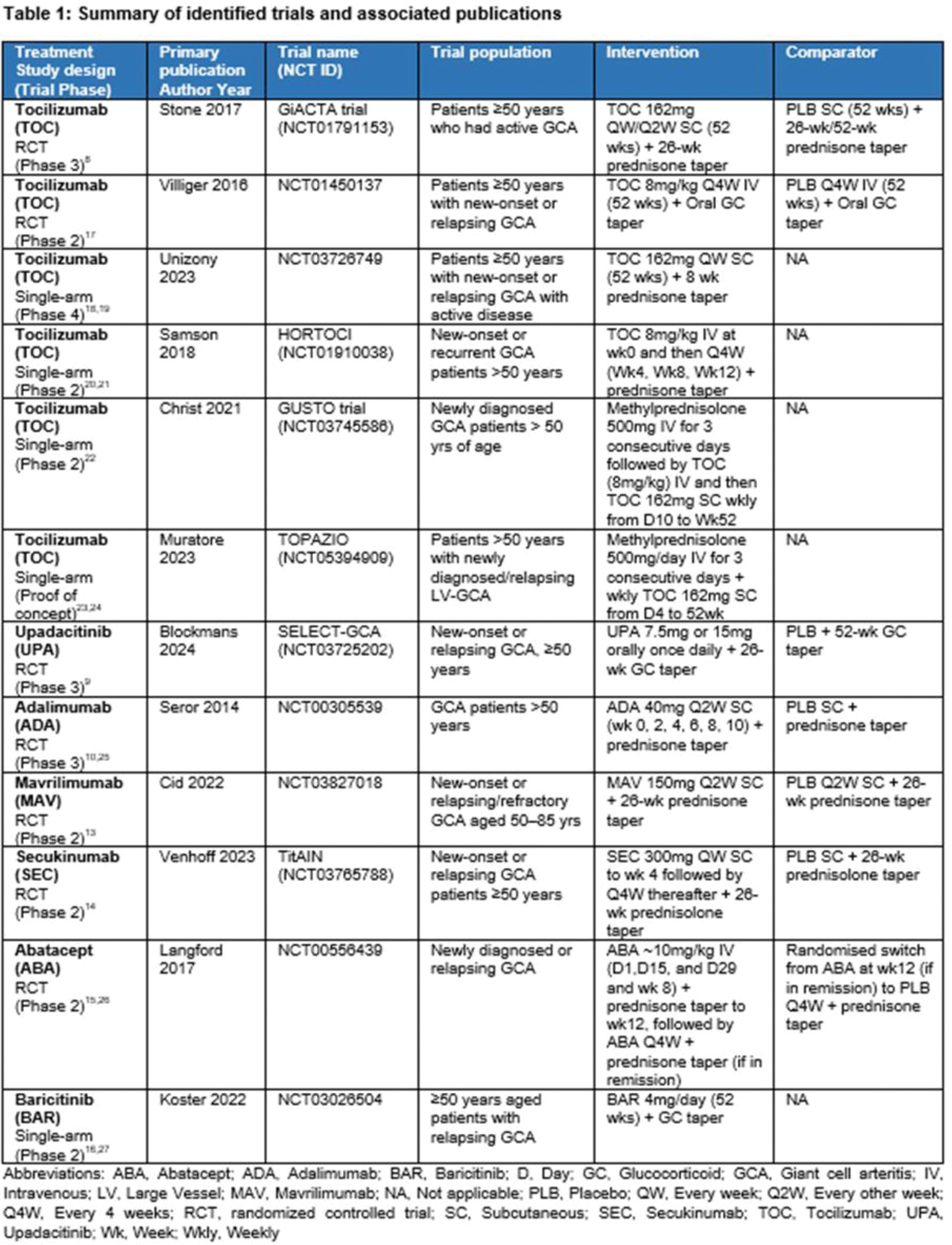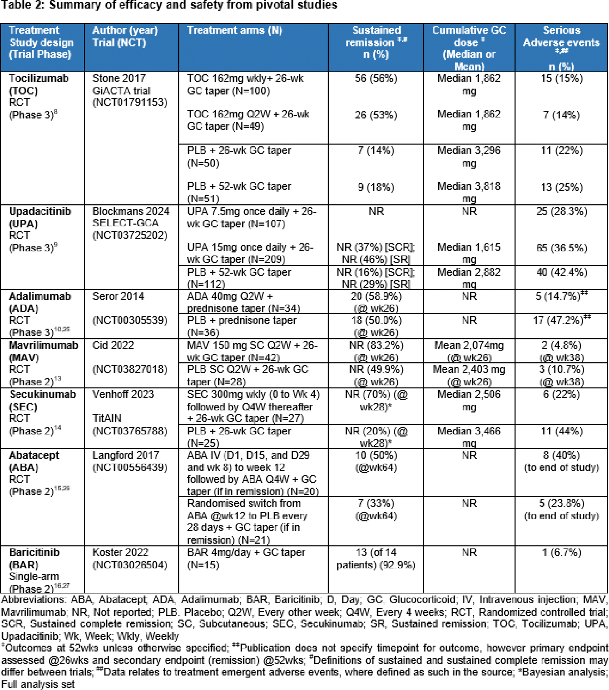Results: A total of 89 publications were identified relating to 12 clinical trials across 7 treatment options (Table 1). The trials included patients with new onset and relapsing GCA. Across the included trials, where published, the mean age of patients ranged between ~69 and ~74 years of age, majority were female (~73%), and White/Caucasian (~97%) (weighted averages). Common symptoms of GCA included headaches, temporal artery abnormalities, jaw claudication and scalp tenderness. Where included in publications, PMR symptoms or features were reported in over half of patients. Tocilizumab (TOC; biologic, IL-6 inhibitor), upadacitinib (UPA; small molecule JAK inhibitor) and adalimumab (ADA; biologic, anti-TNF) were the only treatments reporting results from Phase 3 RCTs [8–12]. The trials concluded that both TOC and UPA, in combination with 26wk GC tapering schedule, demonstrated superior efficacy (sustained remission) and decrease in GC use in comparison to placebo (PLB) (+ GC taper) [8, 9]. Whereas ADA plus GC taper at 26wks was not associated with a significant GC-sparing effect nor reduced rate of relapse compared to PLB (plus GC taper at 26wks) [10]. Data for the remaining 4 treatments were based on Phase 2 RCTs [mavrilimumab (MAV; biologic, GM-CSFr antagonist), secukinumab (SEC; biologic, IL-17A inhibitor), abatacept (ABA; biologic, CLTA-4Ig)] and single-arm trial [baricitinib (BAR; small molecule JAK inhibitor)] [11–16]. MAV, ABA, and SEC in combination with a predefined GC taper all demonstrated superior sustained remission compared to PLB + GC taper. SEC and ABA reported long term remission over a 52 or 64wk treatment period, respectively. A larger randomized trial would be required to further determine the overall efficacy of BAR among the GCA population (Table 2). There was limited published data on safety. Treatments were reported to be well tolerated, without identification of new safety signals compared to their recognized safety profile. Infections or serious infections were among the most commonly reported AEs, with few discontinuing due to safety concerns overall.