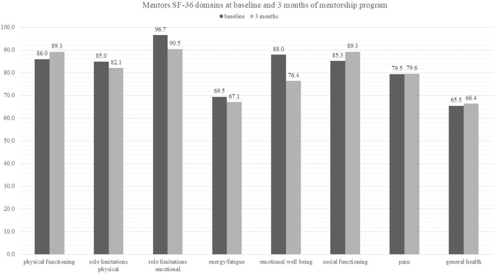 Results: Thirteen mentors started the mentoring program; one mentor left the program due to a stroke, and one mentee chose to stop after one call with her mentor. Twelve pairs completed 6 months of the intervention. Mentors were older than mentees, had lower disease activity, and took less prednisone. ProMAS scores of the mentors at baseline were significantly higher than those of the mentees, indicating better medication adherence (p=0.05) (Table 1). After 6 months of the intervention, mentors expressed numerous positive feelings of mutual connection , friendship, (“an open communication channel”, “a powerful connection”), motherhood (“the mentee was like my child”); reciprocation (“what I gave her, I got back”); empathy (“I found it easy to understand her difficulties”, “my mentee has similar goals as mine”, “reassured knowing that other people are going through similar things”, “my mentee was my mirror”, “I saw another perspective of my own coping”); kinship (“I enjoyed meeting more women like me”); altruism (“I felt like a hero, I felt strong”, “I contributed from my experience”, “The ability to give fulfilled me”, “doing this is a blessing”) and positive wellbeing (“the process made me appreciate my day-to-day life and the fact that I respond well to the medications”, “each meeting fulfilled me”, “the mentorship helped me and made me feel good”). Nevertheless, three mentors experienced challenges in the mentorship process: one did not succeed in establishing a connection with two different mentees, another felt that her mentee did not confide in her and that she was not helping her, and one mentee decided to stop the program after one meeting. The mentor was paired with a new mentee with a successful experience. SF-36 functional and emotional domain scores were high, while energy/fatigue, pain, and general health scores were moderate at baseline, with no statistically significant change at 3 months (Figure 1). Emotional well-being declined numerically at 3 months due to a decrease in the scores of two mentors, with difficulties not related to their disease or the mentorship program.