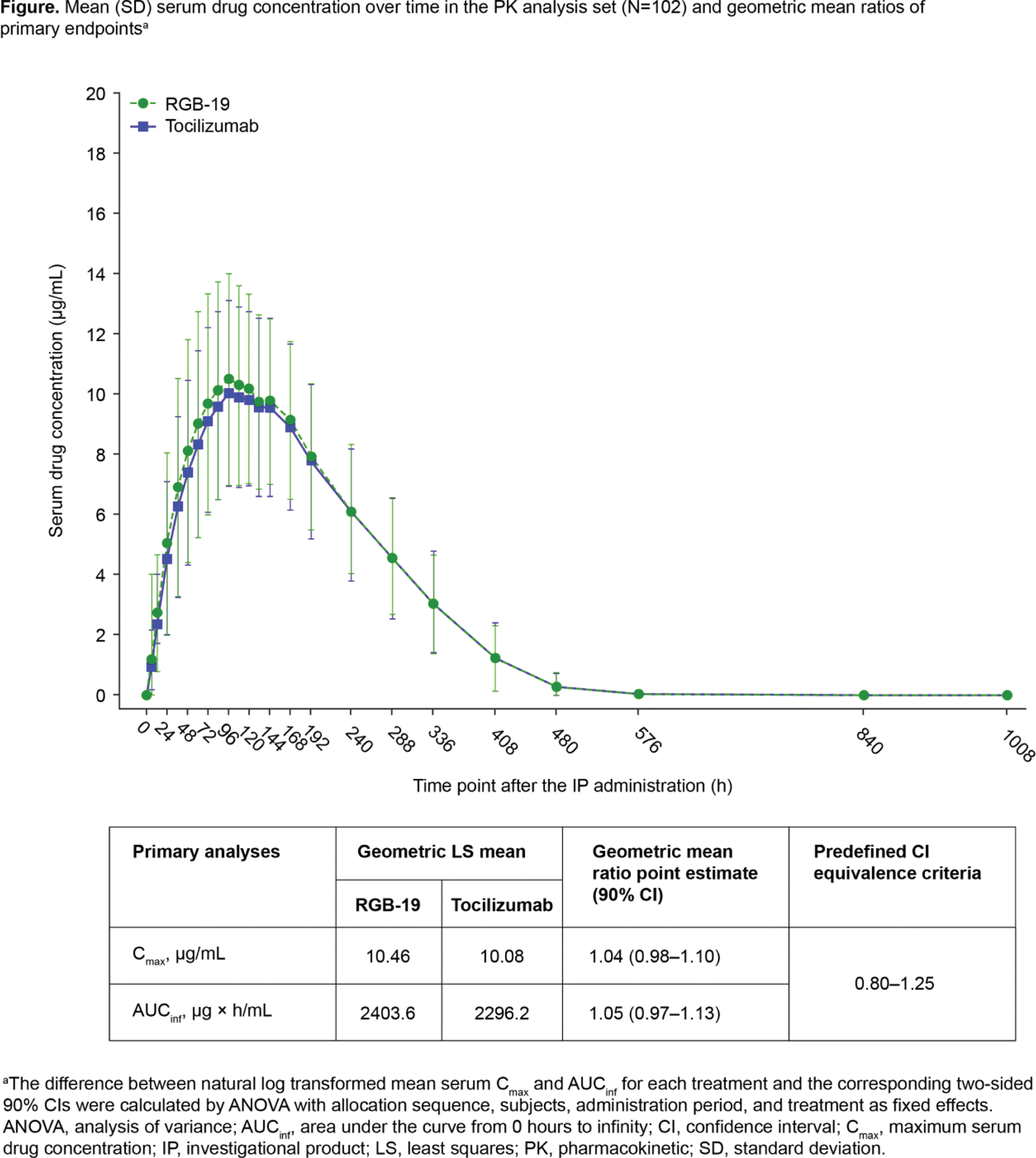 Background: RGB-19, a proposed biosimilar to tocilizumab, is a monoclonal antibody that competitively inhibits the binding of interleukin-6 (IL-6) to its receptor.