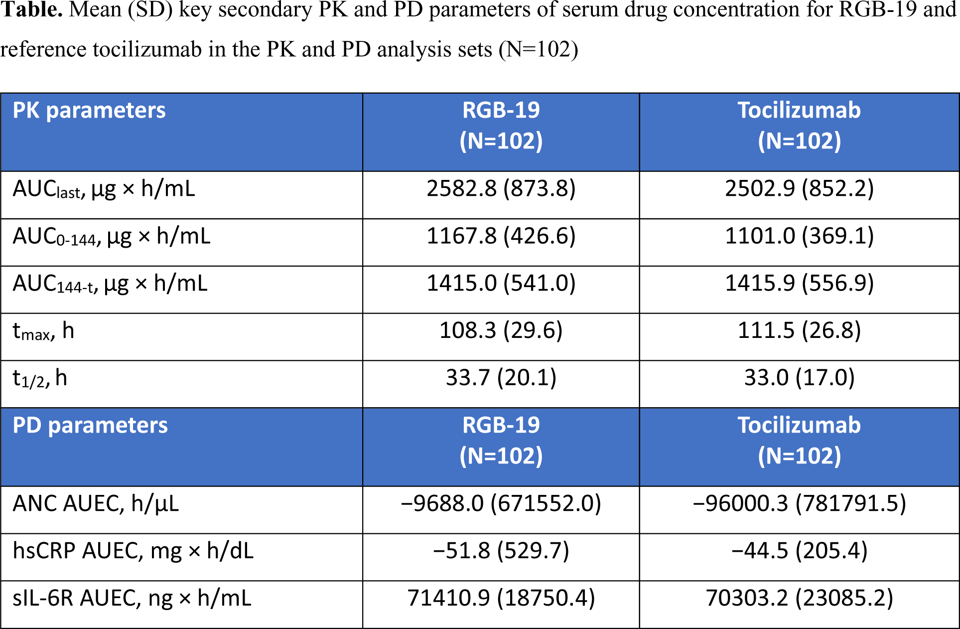 Conclusion: In this study, PK equivalence of the proposed biosimilar RGB-19 was demonstrated, with comparable PD, safety, tolerability and immunogenicity to that of reference tocilizumab.