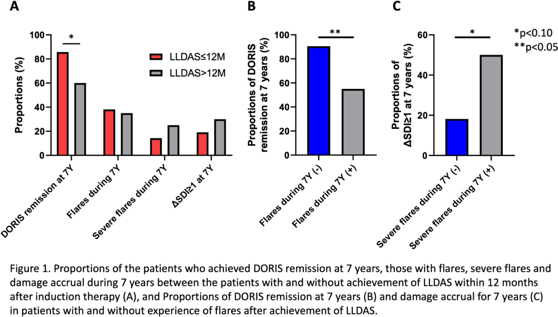 Conclusion: Achieving LLDAS within 12 months after starting remission induction therapy in SLE patients is associated with higher DORIS remission rates at 7 years, particularly among those who remain flare-free during follow-up. Severe flares after achieving LLDAS may contribute to an increased risk of long-term damage accrual, suggesting the importance of optimal maintenance therapy, as well as induction therapy.