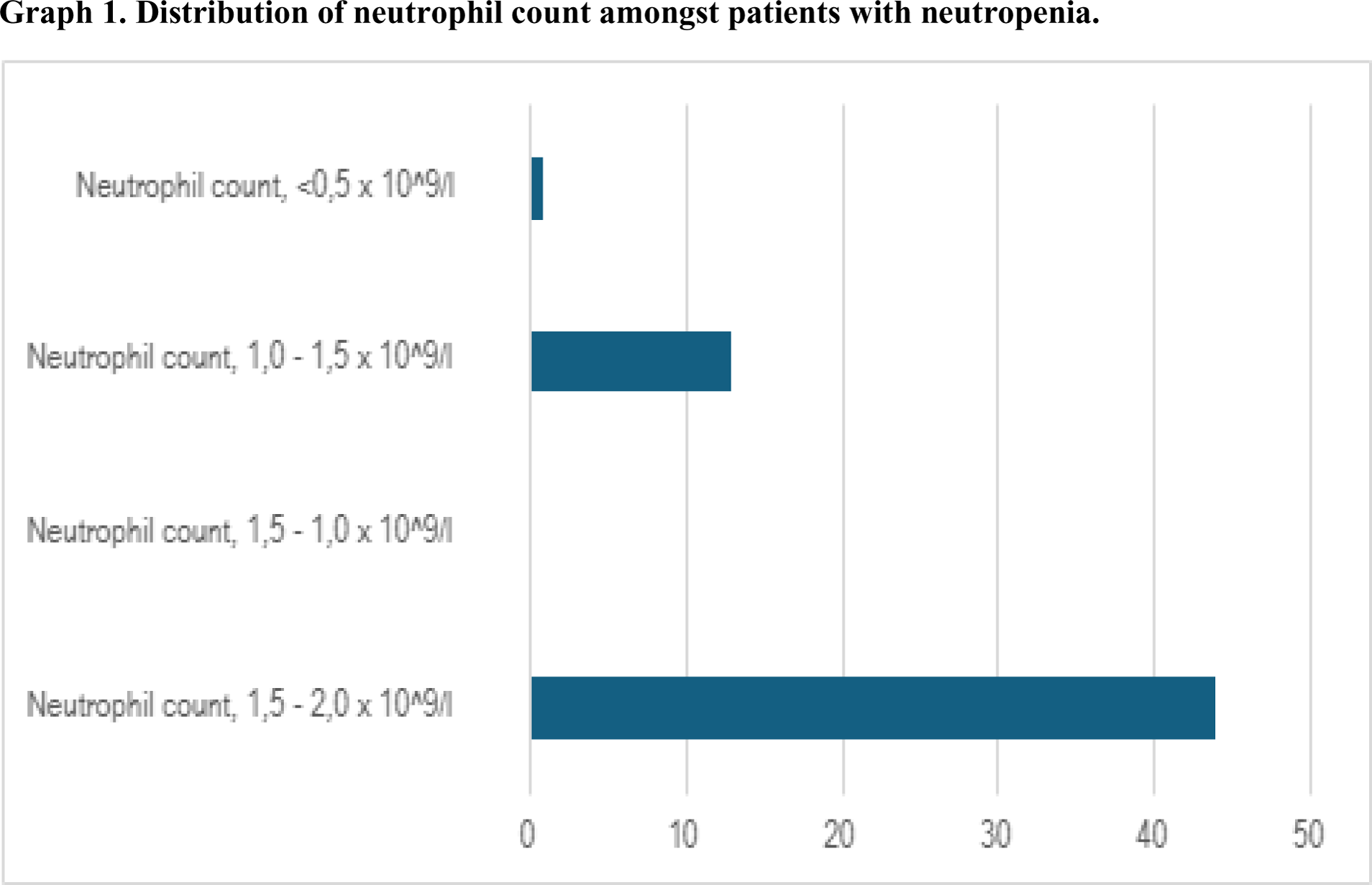 Results: A total of 316 patients with RA receiving TNFi were included. Fifty-eight patients (18.4%) had at least two neutrophil count determinations below 2.0 x 10^9/L: 44 (75.9%) were grade I neutropenias (1.5 – 2.0 x 10^9/L), 0 grade II, 13 (22.4%) grade III (1.0 – 1.5 x 10^9/L), and one patient had severe grade IV neutropenia (<0.5 x 10^9/L). Distribution of neutrophil count amongst patients with neutropenia is shown in Figure 1. Patients who presented grade III or IV neutropenia (11/316, 3.5%) were further evaluated. Their demographic data and disease characteristics are summarized in Table 1. Nine of them (81.8%) were women with a median age of 64 years (range 28-88) and a median duration of RA of 13 years (range 2.2-33). Seven patients (63.3%) were either RF or ACPA positive, and 8 of them (72.7%) had an erosive disease. The median Disease Activity Score in 28 joints (DAS28) was 2.27 (range 1.74-4.14), indicating low disease activity at the time of study inclusion. Six patients (54.5%) were treated with conventional disease-modifying antirheumatic drugs (cDMARDs) and 5 of them (45.5%) were receiving TNFi in monotherapy. All patients presented neutropenia with a median neutrophil count of 1.1 x 10^9/L (range 0.6-1.3), a median white blood cell (WBC) count of 4.7 x 10^9/L (range 3.2-5.6), median hemoglobin (Hb) levels of 12.6 g/L (range 9.9-14.1), and a median platelet count (PLT) of 252 x 10^9/L (range 68-377). Two patients (18.2%) exhibited clonal T-cell expansion with the following immunologic phenotype: both were CD57+ and had monoclonal expression of T-cell receptor constant β chain (TCRB), one of them was CD5+ and CD7+ (patient A), whereas the other one CD3 low , CD5 low , and CD7 low (patient B). Patient A was an 82-year-old woman with seropositive RA (high ACPA titers), who had a disease duration of 3.8 years and was treated with adalimumab. Patient B was a 56-year-old man with a long-standing seronegative RA of 13.2 years of evolution treated with infliximab. Both patients presented an erosive joint disease, and both manifested disease activity at the moment of the inclusion (respectively DAS28 of 2.8 and 4.1). Both were concomitantly receiving cDMARDs (namely methotrexate and/or leflunomide), along with full dosage of TNFi. No other relevant blood count changes were observed in these two patients.