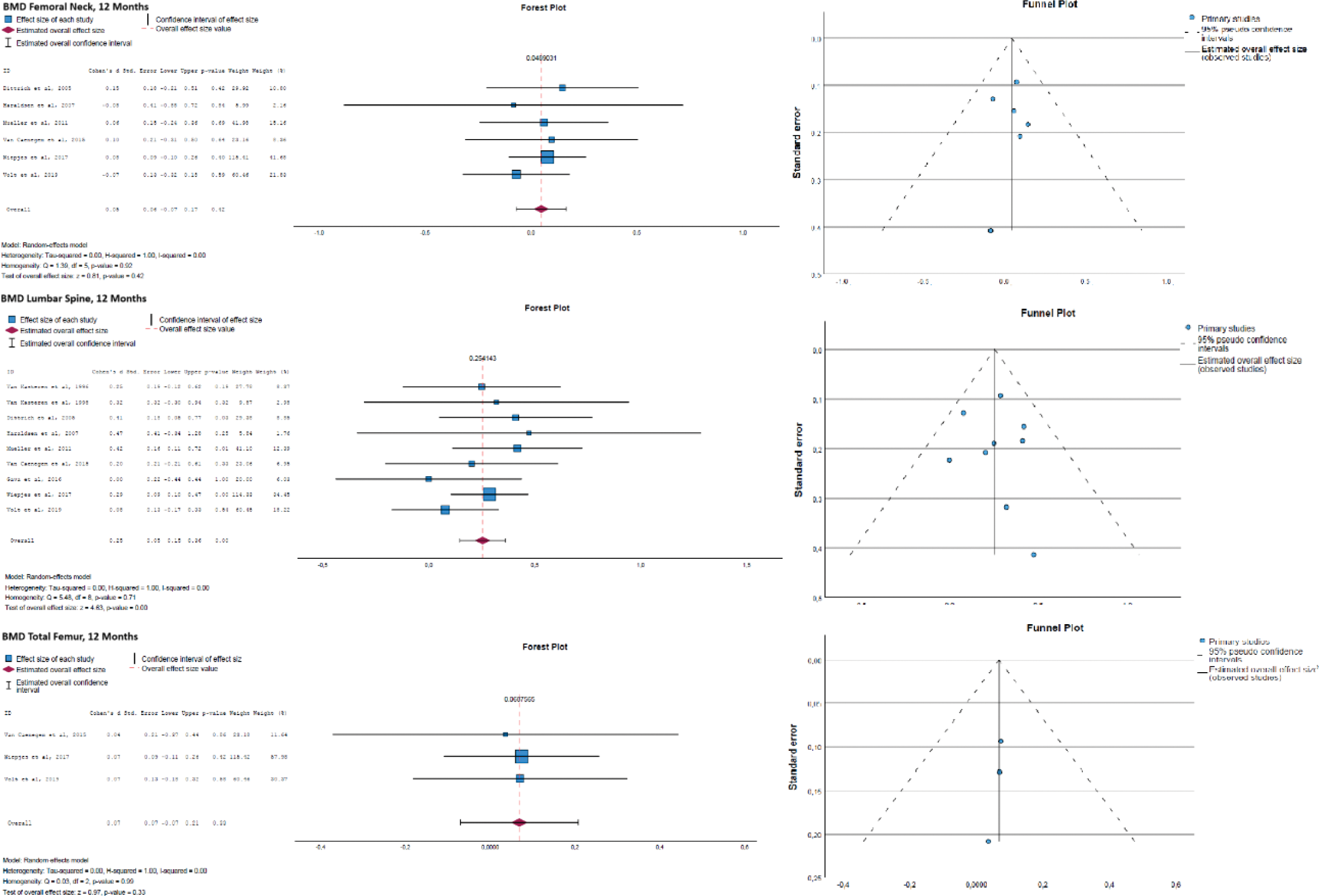 Results: The analysis included 9 studies reporting BMD outcomes in trans women. At the femoral neck, the mean difference in BMD was 0.004 g/cm² (95% CI [−0.03, 0.04]), indicating no significant change. A significant increase in BMD was observed at the lumbar spine, with a mean difference of 0.03 g/cm² (95% CI [0.01, 0.05]). At the total femur, a modest increase was also found, with a mean difference of 0.008 g/cm² (95% CI [−0.01, 0.03]). Heterogeneity across studies was low for all regions, supporting the robustness of the findings. Funnel plots revealed no significant evidence of publication bias.
