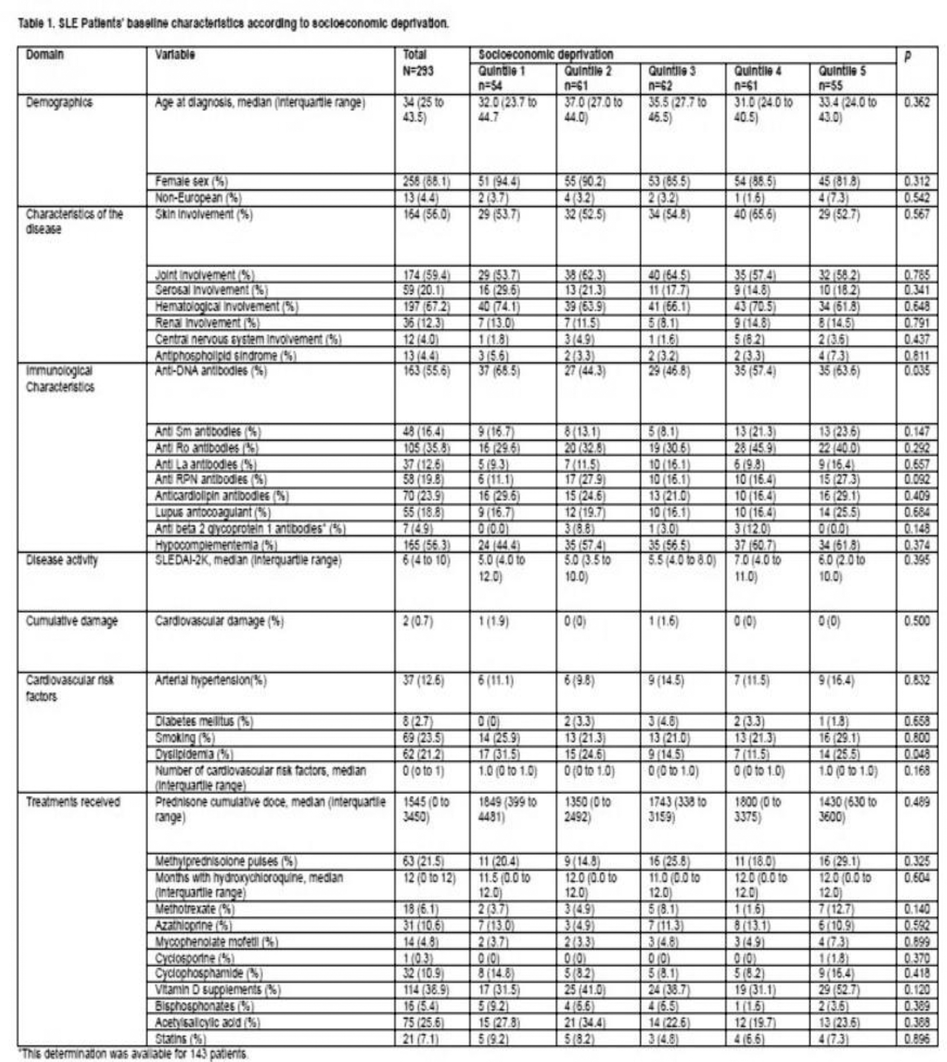 Methods: This observational cohort study included 293 SLE patients from Hospital Universitario Cruces followed for 5 years. Socioeconomic deprivation was assessed using the Socioeconomic Deprivation Index of Euskadi, classifying patients into quintiles (Q1 to Q5). Cardiovascular outcomes included the number of risk factors at diagnosis and at 5 years, and cardiovascular damage assessed by the SLICC Damage Index. Data were analyzed using multilevel linear regression models.