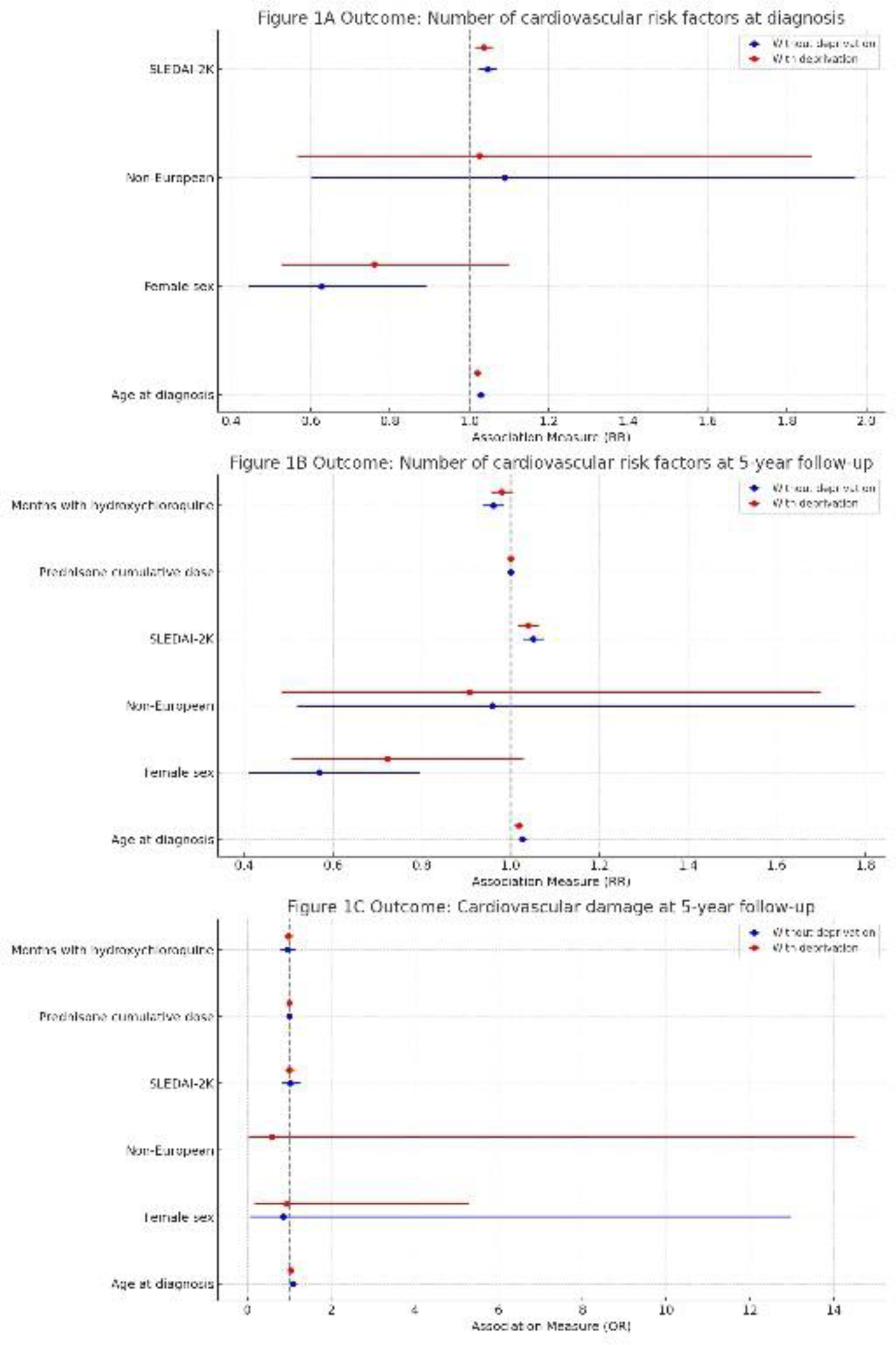 Results: Baseline characteristics showed no significant differences across deprivation quintiles, except for anti-DNA antibodies (p = 0.035) (See Table 1). The multivariate analysis shown in Figure 1 indicated no significant associations between socioeconomic deprivation and the number of cardiovascular risk factors at diagnosis (RR for Q5 vs. Q1 = 1.085, 95% CI: 0.713-1.654, p = 0.702) or at 5 years (RR for Q5 vs. Q1 = 0.977, 95% CI: 0.647-1.475, p = 0.911). No significant association was found between socioeconomic deprivation and cardiovascular damage at 5 years (OR for Q5 vs. Q1 = 1.131, 95% CI: 0.162-7.898, p = 0.901). Cardiovascular damage at diagnosis was not evaluated due to its occurrence in only two patients.