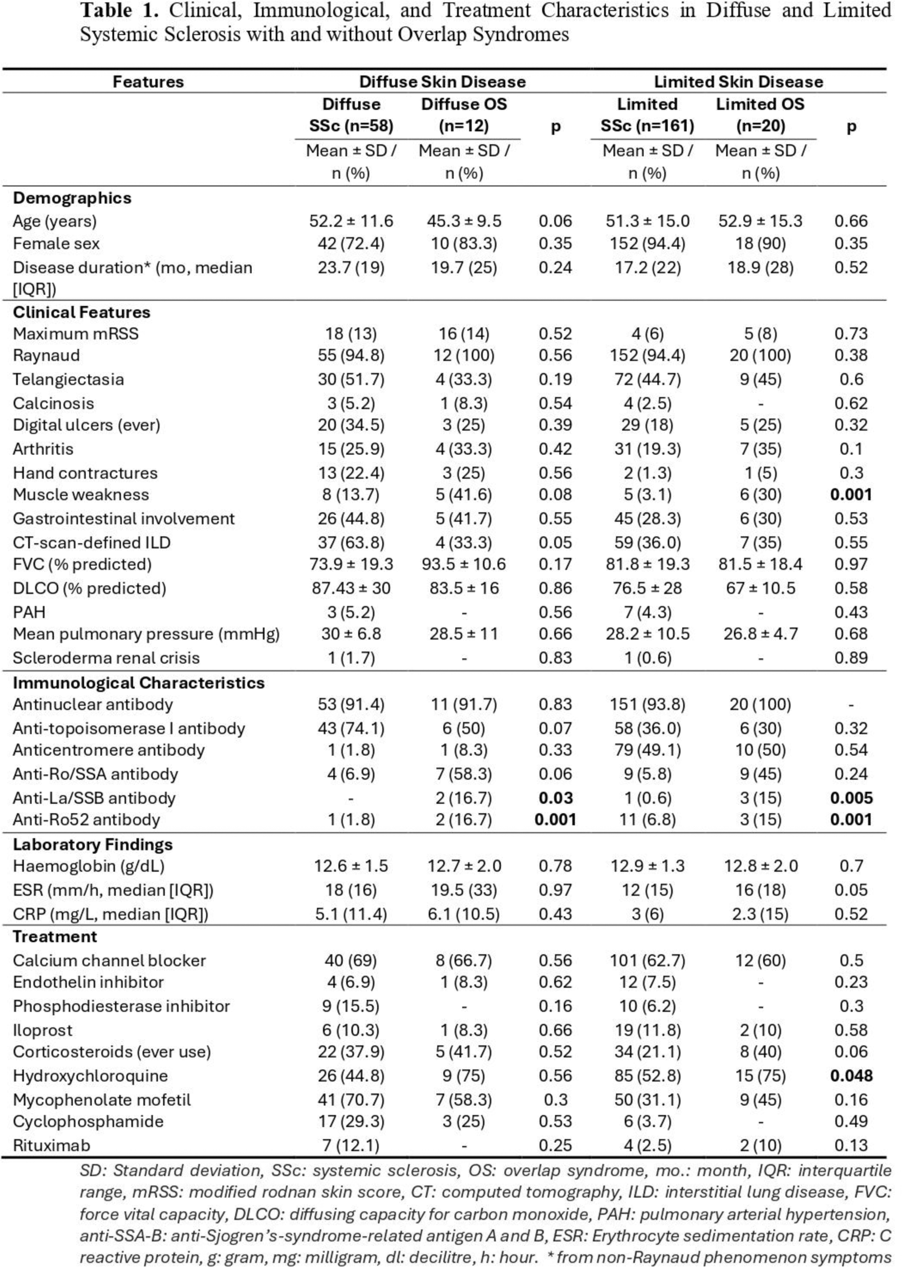 Conclusion: In this study, the prevalence of OS among SSc patients was 13%, consistent with previous literature [1, 2, 3]. Muscle weakness was significantly more common in OS across both diffuse and limited subtypes, whereas ILD was less frequent in diffuse OS compared to diffuse SSc. The higher prevalence of anti-Ro/SSA and anti-La/SSB antibodies in OS patients further highlights the distinct immunological features associated with overlap syndromes, potentially indicating a different underlying disease mechanism. Despite these clinical and immunological differences, OS had a limited impact on treatment preferences. We need longer follow-up period to deliniate the prognostic importance.