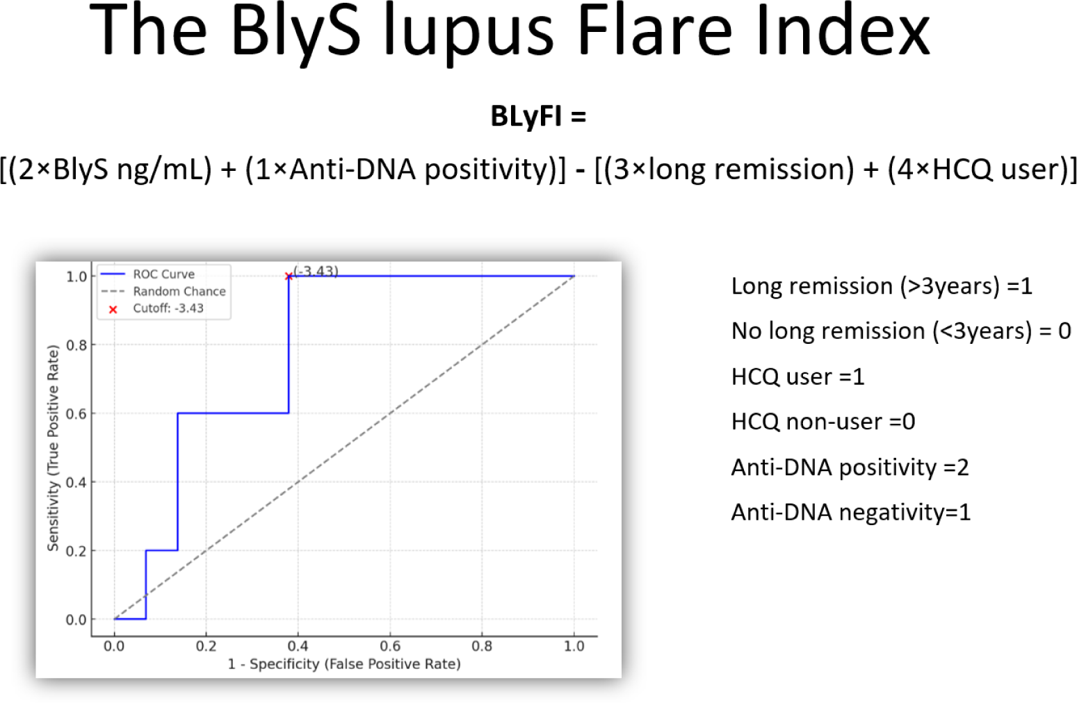 Formula and ROC curve of the BlyS Lupus Flare Index. The red dot marks the selected cutoff of -3.43. Legend: HCQ=hydroxychloroquine.