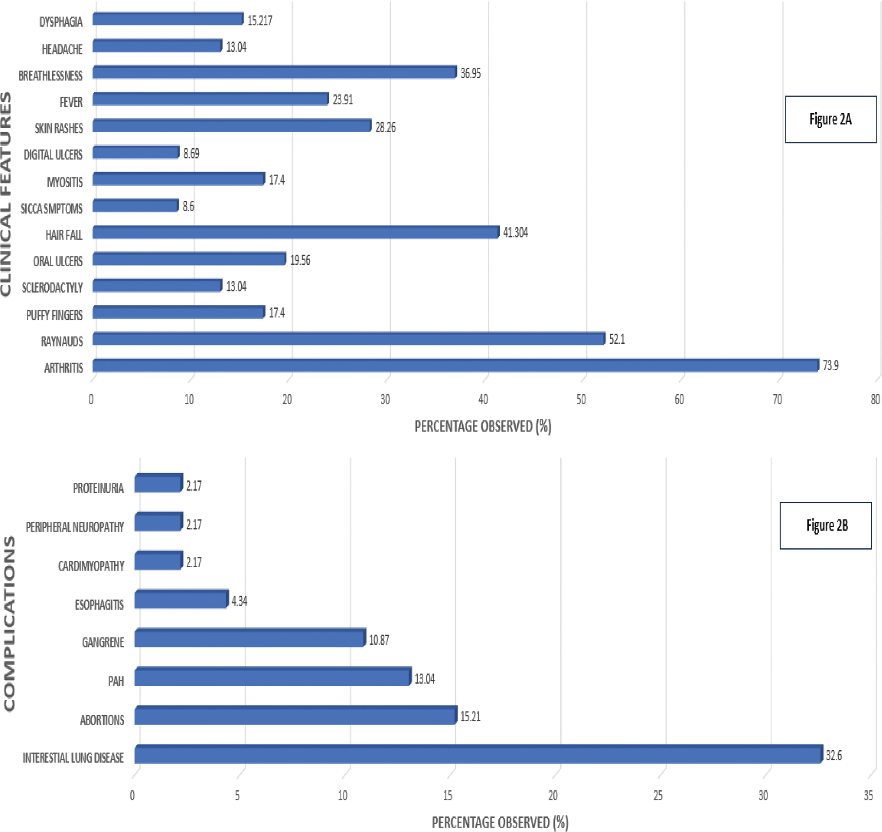 Distribution of clinical features (2A) and complications (2B).