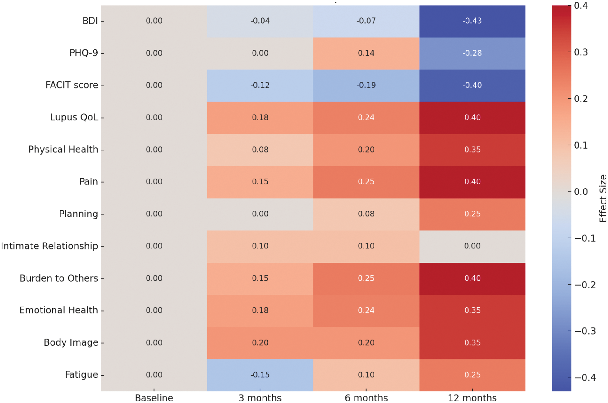 Effect size heatmap of depression and quality of life scores over time during anifrolumab treatment.