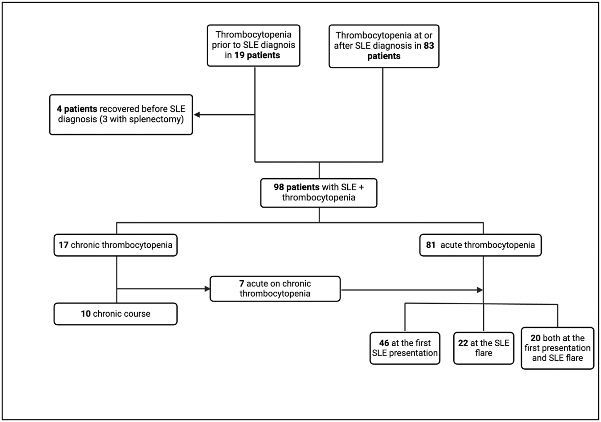 Results: Demographic, serological and laboratory characteristics of 102 patients are shown in Table 1. Four patients (3 with splenectomy) whose thrombocytopenia did not recur after SLE diagnosis were excluded and 98 patients were included in the analysis (Figure 1). The mean SLEDAI of the 66 patients with acute thrombocytopenia at SLE diagnosis was 16.8 (± 9.9), and 40 (60.2%) had a SLEDAI >12. Platelet count was ≤20 × 10 9 /L in 17 patients (25.7%) and >50 × 10 9 /L in 30 (45.5%). Sixty-five patients (98.5%) were managed with glucocorticoids, initiated with intravenous pulse in 32 (48.5%). IVIG was required in 4 (6.1%) patients, CYC was used in 21 (31.8%), AZA in 29 (43.9%) and MMF in 9 (13.6%). Early response was achieved in 21 (31.8%) patients, initial response in 50 (75.8%), and durable response in 60 (90.9%). There was at least one relapse in 38 patients. At the first relapse, rituximab was administered to 9 of 25 patients, and 7 of them did not relapse again. Total 5 patients underwent splenectomy due to refractory disease. Binary logistic regression analysis showed that aPL positivity was a risk factor for relapse [OR (95% CI): 3.8 (1.4-10.3), P =0.009]. Minor bleeding occurred in 24 patients and major bleeding in 13. Median SLICC damage index (SDI) was 1 (IQR:0-3) and 65 patients (63.7%) had SDI ≥1. Patients with at least one relapse had higher SDI than those with no relapse (mean SDI: 2.7 (± 2.4) vs 1.4 (±2.0), P =0.008).