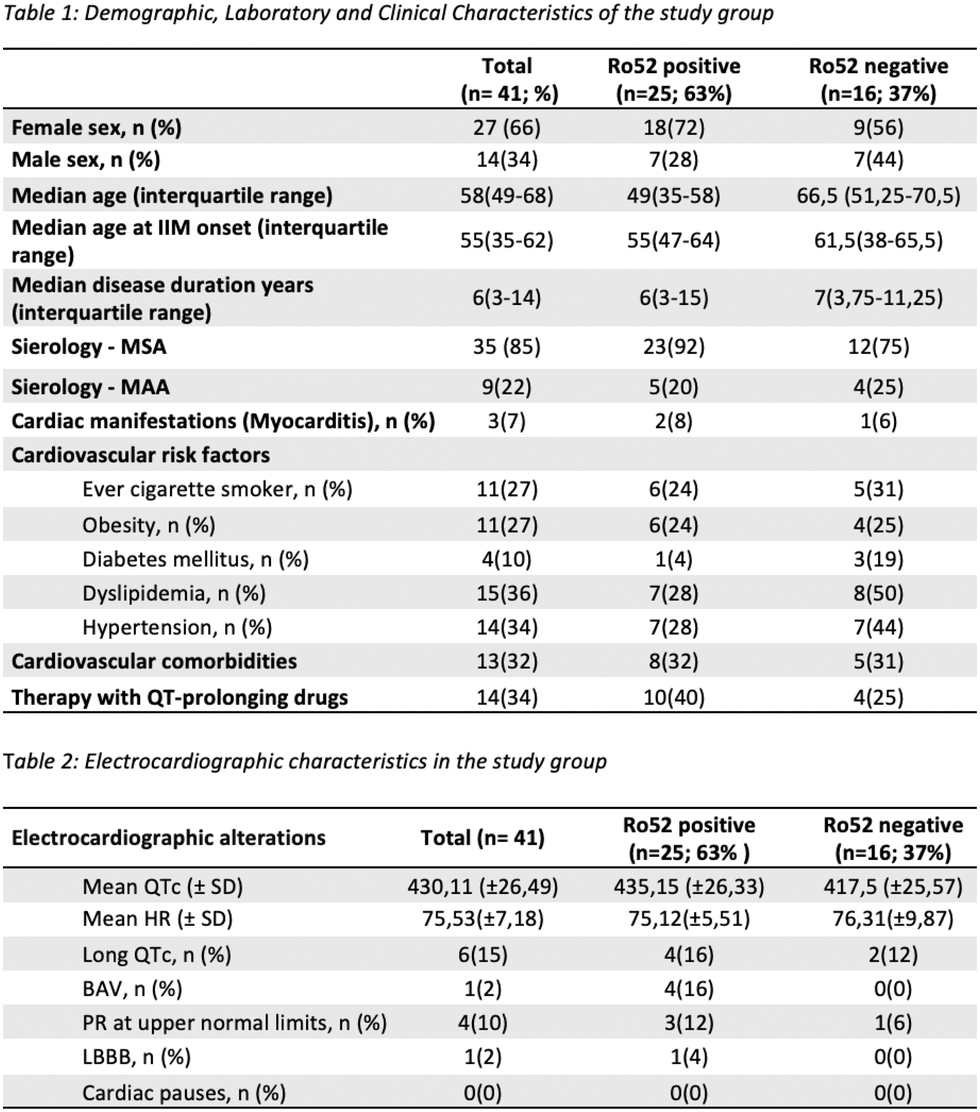 Methods: Forty-one patients with IIM were enrolled [11 polymyositis, 11 dermatomyositis, 5 clinically amyopathic dermatomyositis, 12 antisynthetase syndrome, and 2 immune-mediated necrotizing myopathy; 14 males and 27 females]. The median disease duration at enrollment was 6 years (3-14), the median age at diagnosis was 55 years (35-62), and the median age at enrollment was 58 years (49-68). All patients were positive for myositis-specific antibodies (MSA) or myositis-associated antibodies (MAA). Only three patients had a known clinical history of cardiac involvement, diagnosed as myocarditis (2 positive and 1 negative for anti-Ro52). The population was divided into two groups based on anti-Ro52 positivity (n = 25; M = 7; F = 18) or negativity (n = 16; M = 7; F = 9). All patients underwent 24-hour Holter ECG monitoring, with subsequent analysis using the Cubeholter WS software, trace review by a cardiology specialist, and QTc interval calculation using the Bazett formula. A QTc value of 440 ms for men and 460 ms for women was considered the upper normal limit. Fourteen patients (10 positive and 4 negative for anti-Ro52) were receiving treatment with drugs that are known to potentially prolong the QTc interval at the time of the 24-hour Holter ECG monitoring.