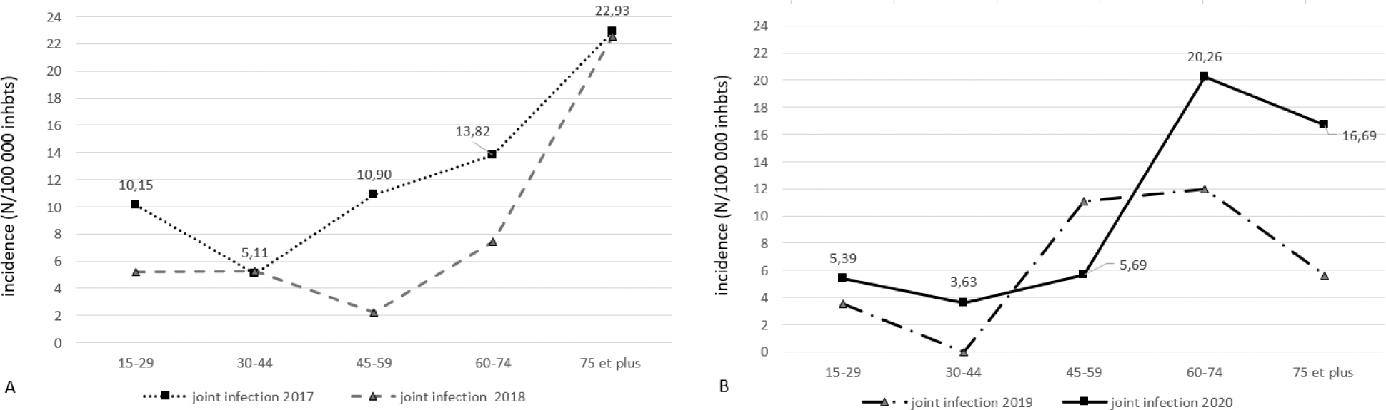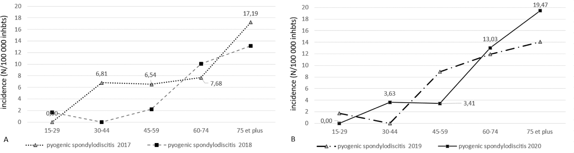 Results: Out of 782 stays identified from PMSI databases, 177 patients were included after removing duplicates and cross-checking diagnoses on medical records. Mean age at BJI diagnosis was 58.6 ± 7.6 years and 67.0 ± 17.8 years (p<0.01) for male and female respectively. Between 2017 and 2020, the overall annual incidence of native SA varied from 12.1/100 000 population to 10.5/100 000 population. The overall incidence of native PS remained stable around 7.1/100 000 population. The male-female ratio was 1.6:1 in both septic arthritis and spondylodiscitis in 2017. in 2020, it increased to 1.9:1 in native SA and to 3:1 in native PS. Age based annual incidence of native JI and PS are presented in Figures 1 and 2. Annual incidence of native JI was higher in patients over 75 years of age in 2017. In 2020, the highest incidence of native JI was reported in patients aged from 60 to 74 years. Between 2017 and 2020, incidence of native JI decreased in all age group except for the 60–74 age group, rising from 13.8/100 000 in 2017 to 20.2/100 000 in 2020 i.e. a 46.5% increase. Annual incidence of native PS remained higher in patients over 75 years of age from 2017 to 2020. Between 2017 and 2020 patients aged from 60 to 74 years exhibited the highest increase of PS incidence rising from 7.68 to 13.03/100 000 (+69.6%). Between 2017 and 2020, 22 patients (12.4%) required ICU management and overall mortality rate decreased from 9.43% to 8.33%. Mortality was significantly higher in patients with a history of diabetes (p=0.0016), hypertension (p<0.001) or chronic inflammatory rheumatism (p<0.01).Hypertension, chronic inflammatory rheumatism and endocarditis were more frequent in patient requiring ICU care (p=0.042, p=0.014, p= 0.042 respectively).Staphylococcus was the most common identified pathogen, occurring in 82 patients (48.0%) with over representation of Staphylococcus aureus (70 cases).