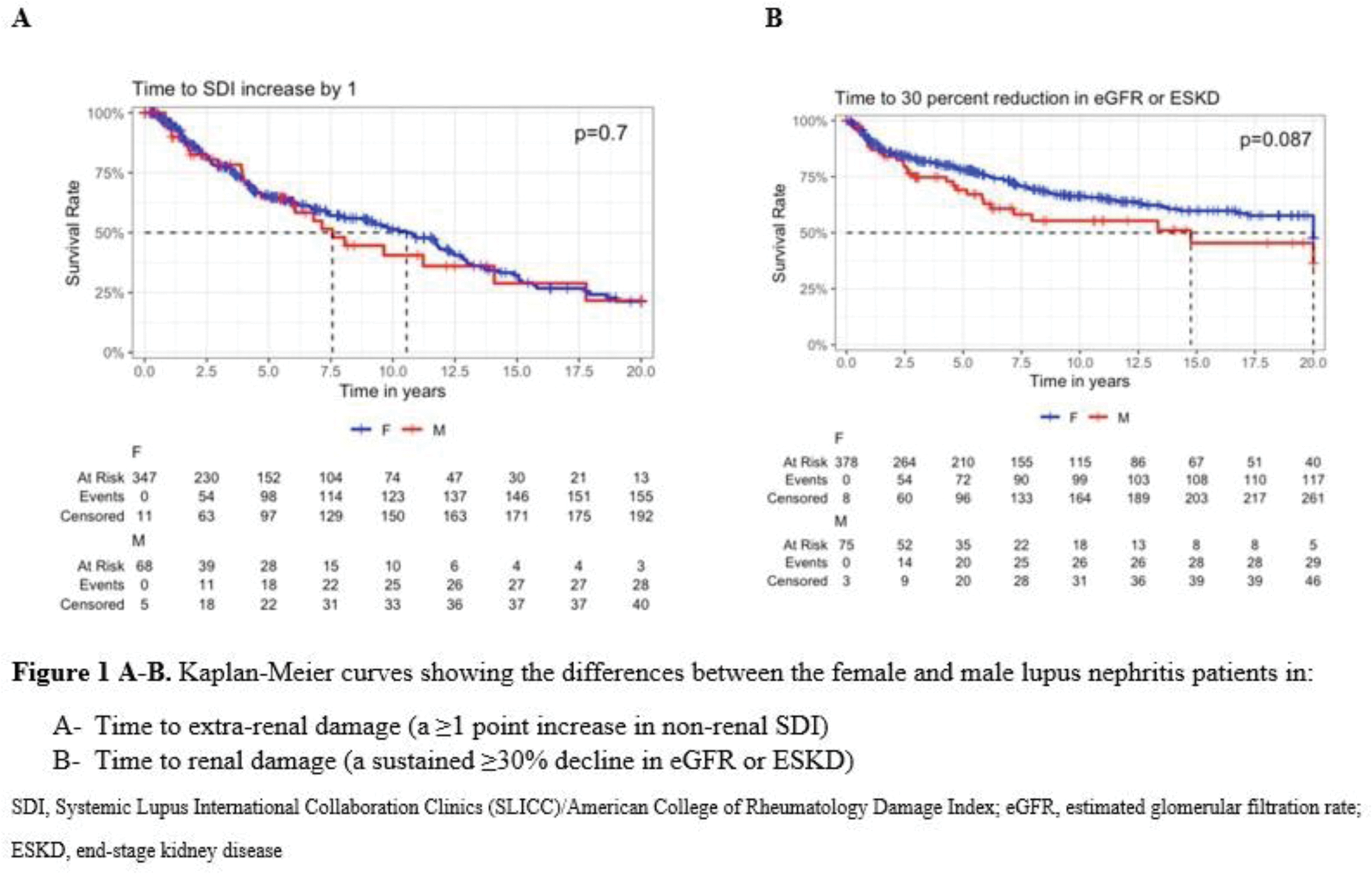 Results: The LN cohort included 460 patients, with a predominance of females (83.5%) and a median age of 33 years. Female patients were more likely to be Black, and there were no significant differences in baseline SDI or renal histology between males and females (Table 1). Over a median follow-up of 8.6 years [IQR: 4.1, 14.9], 45% of patients accrued extra-renal damage, while 32% experienced renal damage. Notably, the median time to extra-renal damage was numerically shorter than that for renal damage (4.1 [1.6, 8.7] vs. 5.5 [1.7, 11.3] years). No significant differences in the accrual of either extra-renal or renal damage were observed between males and females, and the time to these outcomes was not statistically different between sexes (Figure 1). The most common SDI items identified in the 188 patients who accrued extra-renal damage were ocular (36.7%), diabetes mellitus (15.4%), skin (13.8%), musculoskeletal (9.6%), and neurologic (8.5%). Aside from neurologic damage, which was more prevalent in males (20.7% [6/29] in males vs. 6.2% [10/159] in females, p = 0.04), no significant differences based on sex were found. When examining the SDI organ items, peripheral neuropathy was more frequent in males (13.8 [4/29] % vs. 2.5% [4/159], p = 0.02). Multivariate analyses revealed that male sex was not associated with greater damage accrual, either extra-renal (HR 1.04, 95% CI 0.71–1.54) or renal (HR 1.27, 95% CI 0.69–2.32).