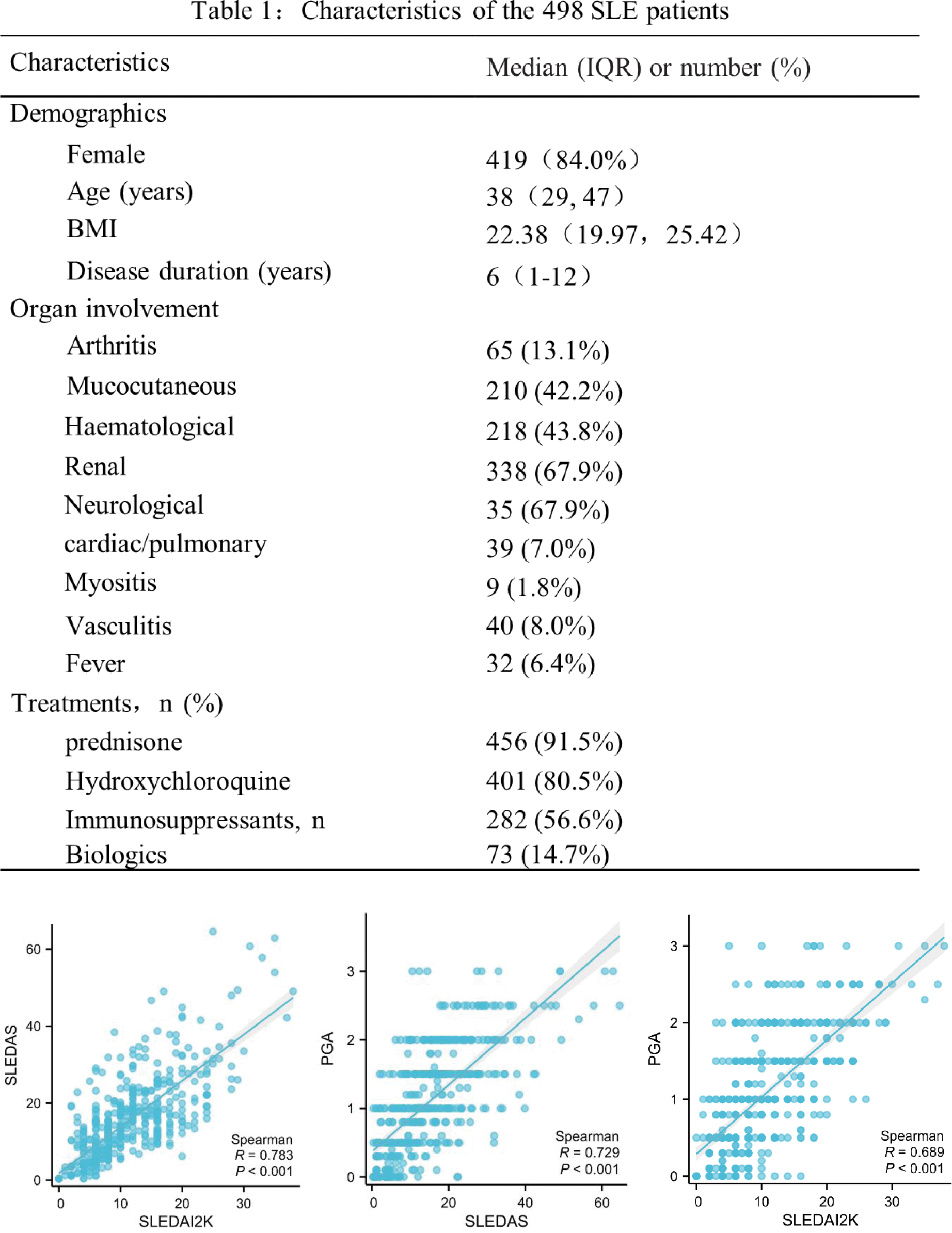 Methods: We retrospectively studied 498 patients with SLE (fulfilling the classification criteria of ACR 1997 and/or SLICC 2012 and/or EULAR/ACR 2019) from Peking University First Hospital. Disease activity was quantified using Physician Global Assessment (PGA), SLEDAI-2K, and SLE-DAS. Demographic, clinical and laboratory parameters were also collected. To assess the performance of various instruments, we compared the correlations and agreements between SLE-DAS, PGA and SLEDAI-2K. We also we evaluated whether SLE-DAS was associated with serum complement levels.