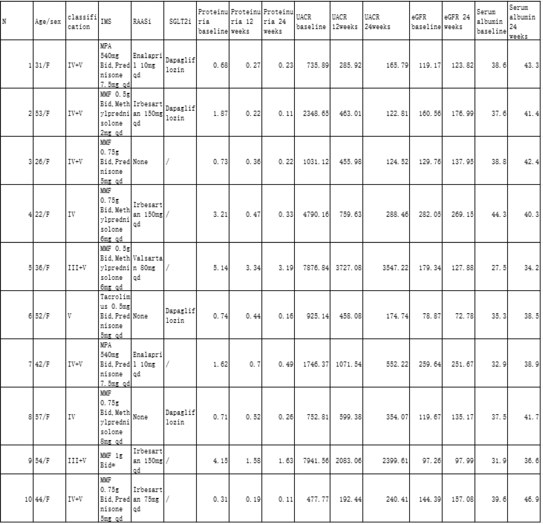 Methods: Ten patients with histologically confirmed LN, stable on glucocorticoids, immunosuppressants, and RAASi for at least six months, were enrolled (Table 1).