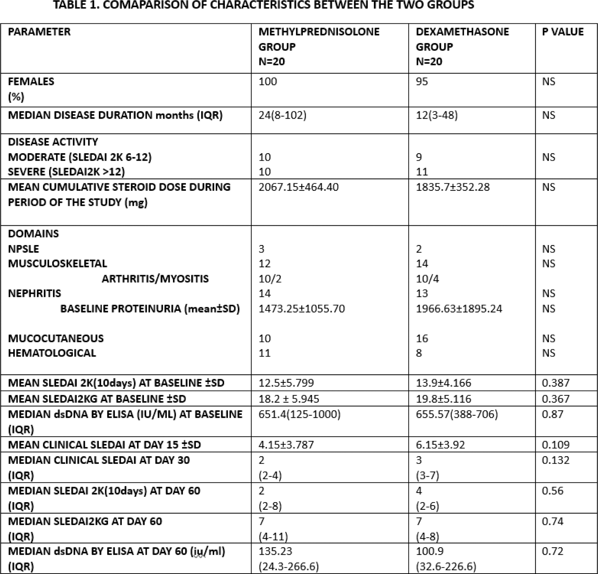 Methods: This randomized, open-label, single-center trial included 40 hospitalized adult patients with moderate to severe SLE (SLEDAI-2K ≥6). All hospitalized patients of SLE who have previously met or currently meet the 2012 SLICC and/or 2019 ACR criteria for SLE were included in the trial after obtaining written informed consent. The patients were randomized based on disease activity (i.e. SLEDAI2K score 6-12 and SLEDAI 2K>12) to receive either IV Methylprednisolone 250 mg for 3 days or IV Dexamethasone 8 mg BD for 3 consecutive days. The randomization list was generated using a computer software employing random number algorithms and stratified randomization was done. Both groups subsequently received standard of care as per physician discretion in accordance with the current international guidelines. Following the intervention, clinical SLEDAI was assessed at day 15 and day 30. SLEDAI2K (10days) and SLEDAI2KG were assessed at baseline and day 60. SLEDAI-2KG is a validated modification of the SLEDAI2K that describes disease activity while accounting for Glucocorticoid dose. SRI-50 response for each clinical domain was calculated at day 15, day 30 and day 60 for the clinical parameters and was calculated only at day 60 for the laboratory parameters. SRI 50 response is a set of validated definitions of 50% improvement in each of the SLEDAI-2K descriptors. Statistical analysis was performed using chi-square tests for categorical data and t-tests or Mann-Whitney U tests for continuous data, with a significance threshold of p < 0.05.