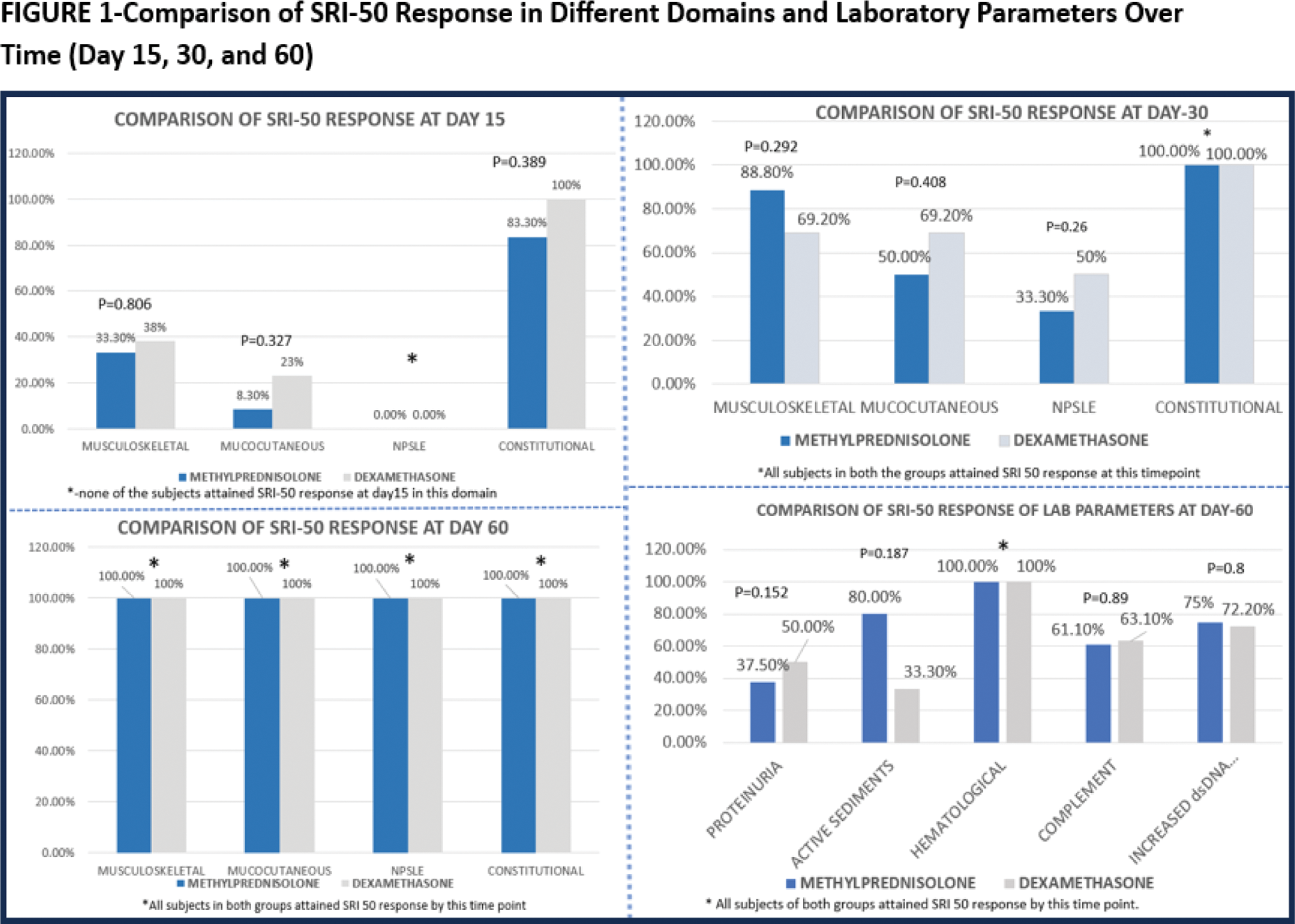Results: We included 40 SLE patients, the baseline characteristics were well-matched between the groups, with mean SLEDAI-2K scores of 12.5 in the methylprednisolone group and 13.9 in the dexamethasone group (p = 0.386). The cumulative steroid dose at 60 days was higher in the methylprednisolone group, though the difference was not significant (Table 1). Both groups showed significant improvement in SLEDAI-2K scores from baseline to day 60, with no statistically significant difference at any time point (p > 0.05) (Table 1). SLEDAI-2KG scores followed a similar trend, indicating comparable steroid-sparing effects in both groups. Across various SLE domains, SRI-50 response rates at days 15, 30, and 60 showed no statistically significant differences between methylprednisolone and dexamethasone (Figure 1). In all the clinical domains, SRI 50 response was achieved in 100% of the patients in both the groups by day 60. Among laboratory parameters, both treatments achieved 100% response by day 60 in the hematological domain. Constitutional domain was the earliest to show SRI 50 response by day 15(83% of methylprednisolone vs 100% of dexamethasone group) (Figure 1). Cost of dexamethasone was significantly lesser than methylprednisolone ($0.77 vs $33.69 respectively).