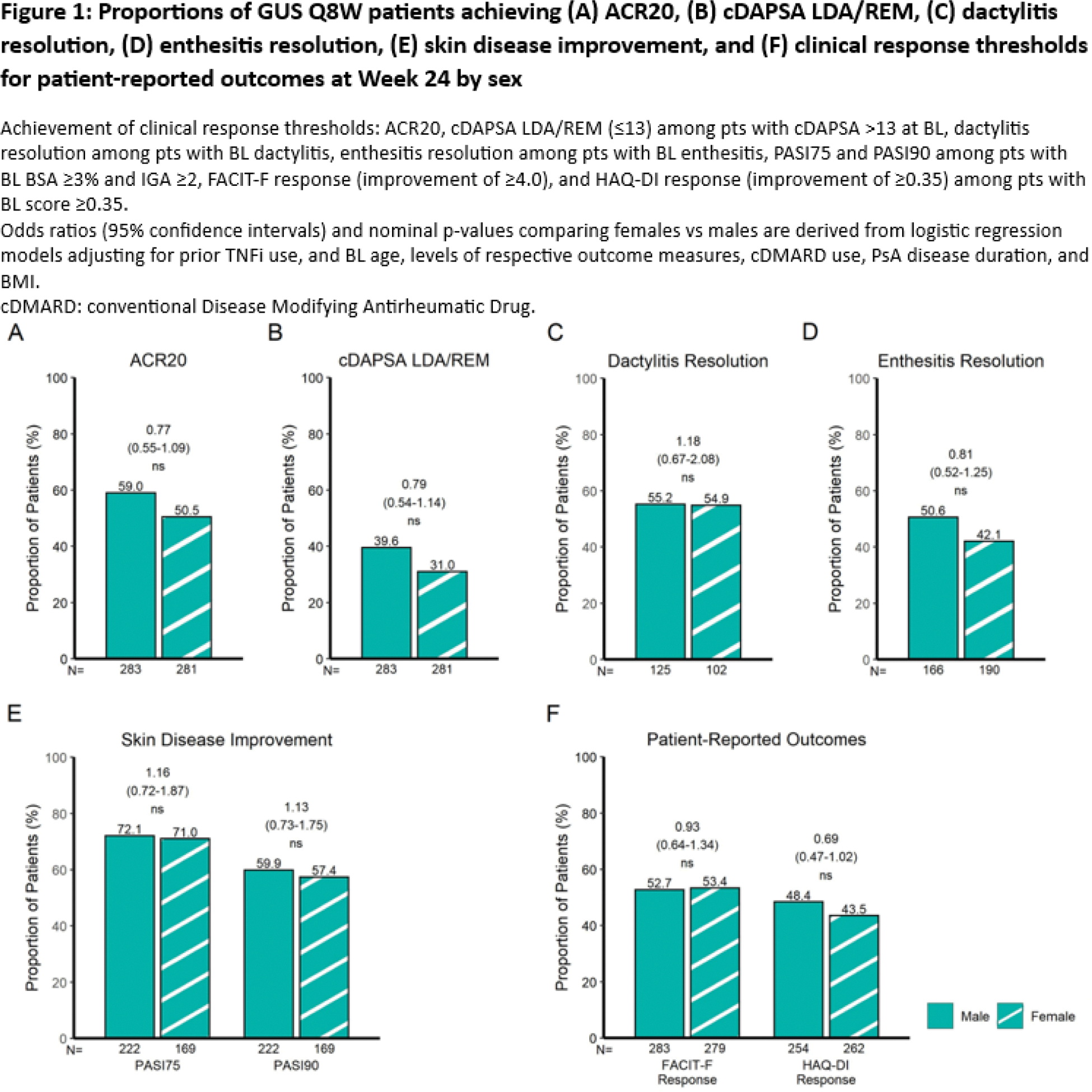 Results: Among 564 PsA pts treated with GUS Q8W, no significant difference in GUS efficacy was observed between female and male pts as measured by the primary efficacy outcome common to the 3 RCTs (ACR20) and across PsA domains at W24 (Figure 1). After adjusting for baseline characteristics with sex-specific differences in the pooled cohort, including age (female vs male; mean: 48.2 vs 46.1 years; p=0.0007), PsA duration (6.9 vs 6.0 years; p=0.0086), and BMI (29.9 vs 28.8 kg/m 2 ; p=0.0007) 2 , GUS efficacy was found to be comparable between sexes in terms of achieving ACR20 response (female vs male; 50.5 vs 59.0%; odds ratio [OR] [95% confidence interval (CI)]: 0.77 [0.55-1.09]; not significant [ns]; Figure 1A); composite measure indicating low levels of joint disease activity (cDAPSA LDA/REM: 31.0 vs 39.6%; OR [95% CI]: 0.79 [0.54-1.14]; ns; Figure 1B); dactylitis resolution (54.9 vs 55.2%; OR [95% CI]: 1.18 [0.67-2.08]; ns; Figure 1C); enthesitis resolution (42.1 vs 50.6%; OR [95% CI]: 0.81 [0.52-1.25]; ns; Figure 1D); skin disease improvement (PASI75: 71.0 vs 72.1%; OR [95% CI]: 1.16 [0.72-1.87]; ns and PASI90: 57.4 vs 59.9%; OR [95% CI]: 1.13 [0.73-1.75]; ns; Figure 1E); and clinically meaningful improvements in pt-reported outcomes (FACIT-F: 53.4 vs 52.7%; OR [95% CI]: 0.93 [0.64-1.34]; ns and HAQ-DI: 43.5 vs 48.4%; OR [95% CI]: 0.69 [0.47-1.02]; ns; Figure 1F).