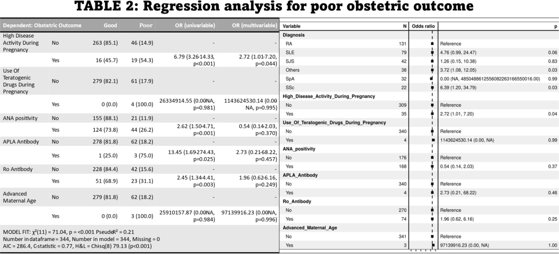 Methods: Total of 261 cases and 272 age-matched controls participated in a questionnaire-based study to assess autoimmune and inflammatory rheumatic diseases (AIRD). Participants provided demographic information, disease type, current activity, medications, pregnancy details, and obstetric outcomes. They were categorized into six groups: Rheumatoid Arthritis (RA), Systemic Lupus Erythematosus (SLE), Spondylarthritis (SpA), Sjögren’s Syndrome (SjS), Scleroderma, and Others. Two-thirds of the patients had disease durations of less than five years. Key predictors of adverse obstetric outcomes for AIRD patients included high disease activity during pregnancy, use of teratogenic drugs, ANA positivity, Ro positivity, antiphospholipid syndrome, and maternal age over 35 years. Data was managed in Microsoft Excel and analysed using SPSS v23 (IBM Corp.), presenting descriptive statistics and performing regression analyses to assess predictors of poor obstetric outcomes. A bidirectional stepwise selection was used to determine the most significant variables for the final predictive model.