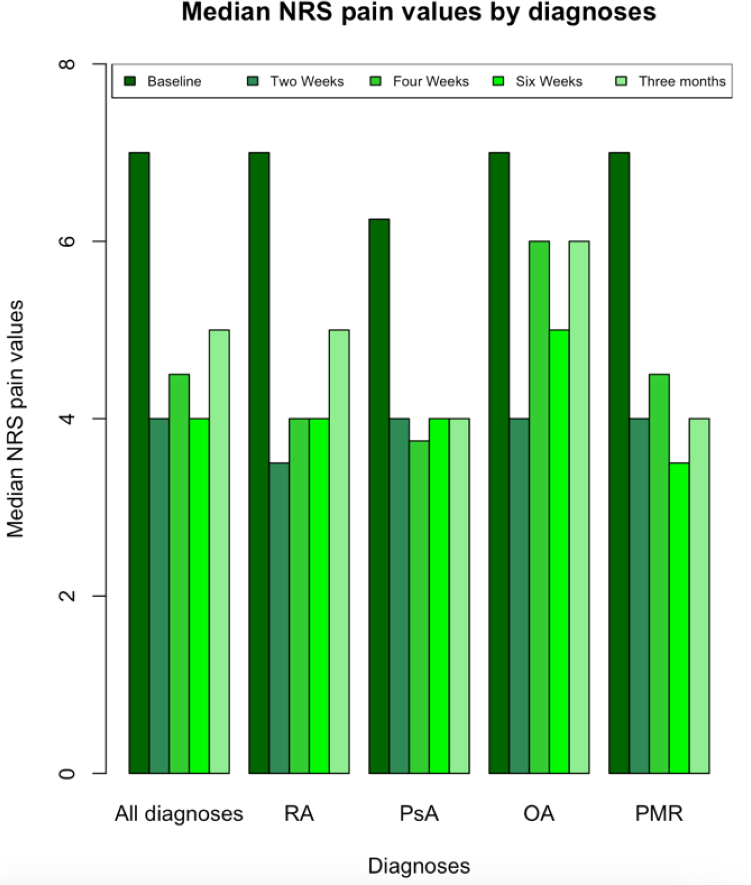 Median NRS pain values for various diagnoses at baseline and follow-up time points. The diagnoses include all the diagnoses, RA, PsA, OA and PMR. The various tinted green bars represent VAS pain values from left to right at baseline, two weeks, four weeks, six weeks and twelve weeks.