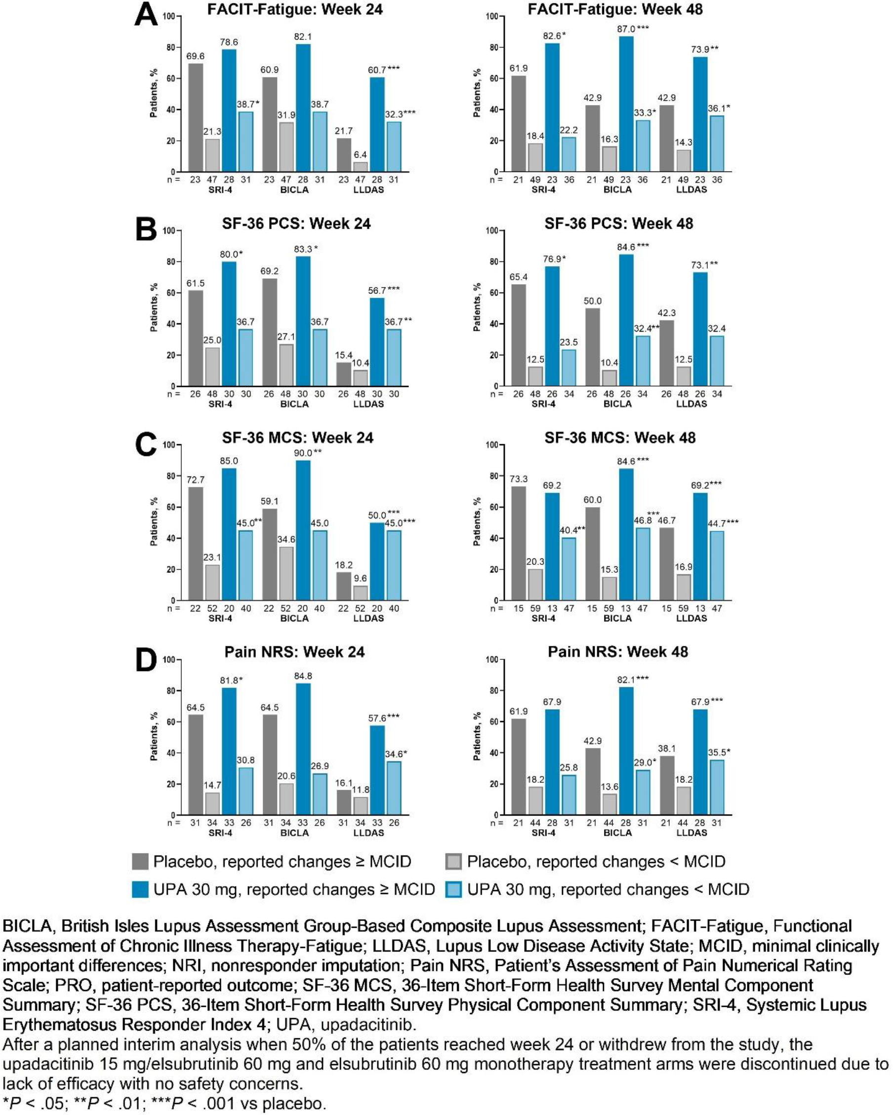 Methods: SLEek was a phase 2, randomized, double-blind, placebo-controlled trial evaluating the efficacy and safety of UPA and elsubrutinib (a Bruton’s tyrosine kinase inhibitor) when administered as monotherapy or combination therapy. Patients with moderately to severely active SLE were randomized 1:1:1:1:1 to receive once-daily UPA 30 mg and elsubrutinib 60 mg, UPA 15 mg and elsubrutinib 60 mg, UPA 30 mg monotherapy, elsubrutinib 60 mg monotherapy, or placebo for 48 weeks. Here, we report results from the UPA 30 mg monotherapy and placebo arms. Assessments included achievement of British Isles Lupus Assessment Group-Based Composite Lupus Assessment (BICLA), Systemic Lupus Erythematosus Responder Index 4 (SRI-4), and Lupus Low Disease Activity State (LLDAS) responses among patients who reported or did not report minimum clinically important differences (MCID) in PROs at weeks 24 and 48. MCIDs were based on previously published thresholds of ≥ 4-point increase in Functional Assessment of Chronic Illness Therapy (FACIT)-Fatigue (in patients with FACIT-Fatigue ≤ 48 at baseline), ≥ 2.5-point increase in 36-Item Short-Form Health Survey Physical and Mental Component Summary scores (SF-36 PCS and MCS scores; in patients with SF-36 PCS and MCS scores ≤ 97.5 at baseline), and ≥ 1-point reduction from baseline in Patient’s Assessment of Pain Numerical Rating Scale (Pain NRS, 0–10 scale; in patients with baseline Pain NRS ≥ 1). Missing data were handled using nonresponder imputation. Between-group differences and P values (UPA vs placebo) were estimated using the Cochran-Mantel-Haenszel test, adjusted for baseline corticosteroid dose, Systemic Lupus Erythematosus Disease Activity Index 2000 score at screening, baseline interferon score, and baseline immunosuppressant use.