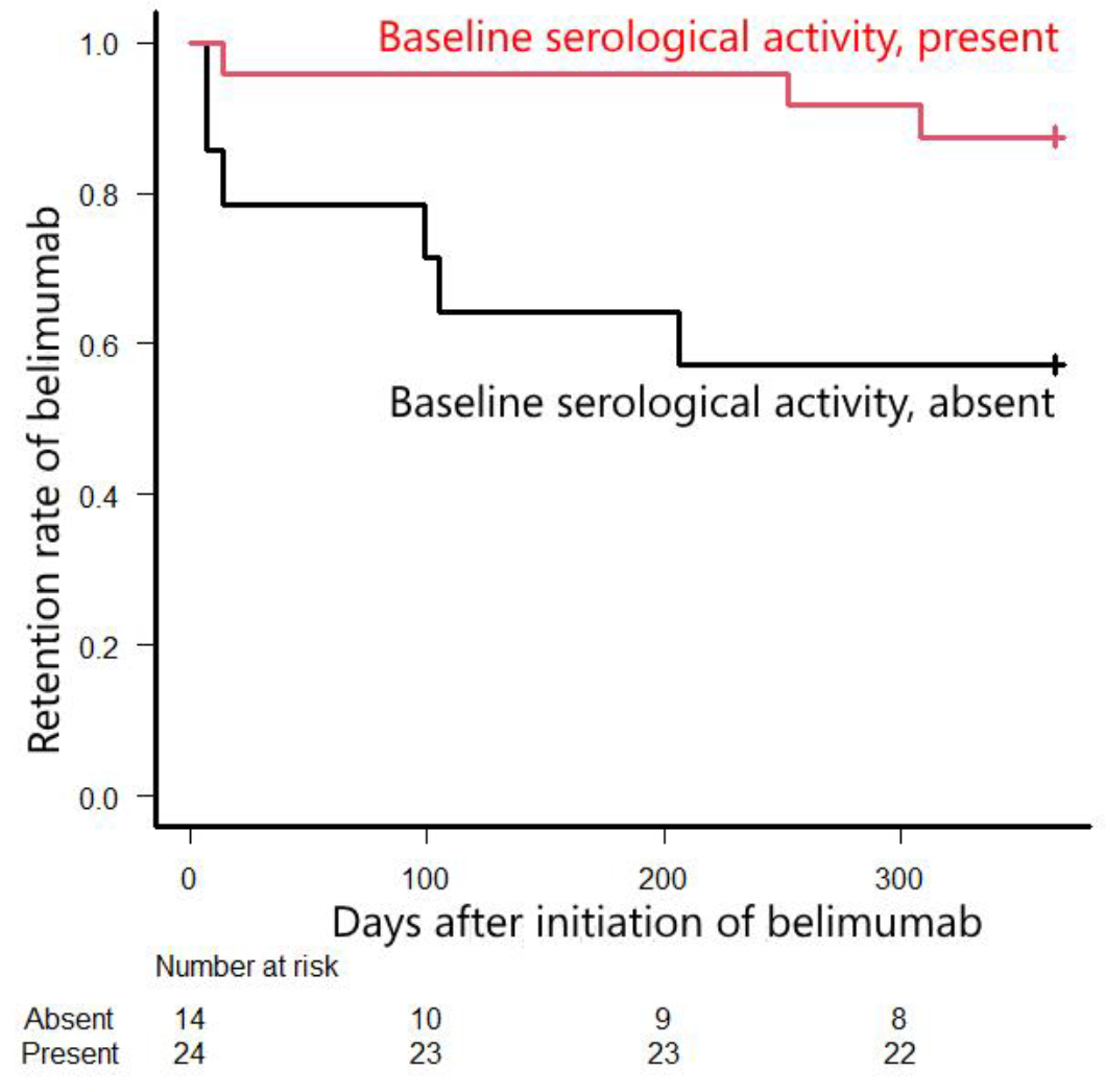 Results: All 38 consecutive patients with SLE who received belimumab during the study period were included. At baseline (at the time of belimumab initiation), 35 patients (92%) were female, the age was 18–68 years (median 42 years), and the disease duration was 0–37 years (median 16 years). At baseline, the dosage of PSL-equivalent GC was 4–28 mg/day (median 10 mg/day), and hydroxychloroquine and immunosuppressants were used concomitantly in 22 (58%) and 32 (84%) patients, respectively. Fifteen (39%) patients discontinued belimumab, and 4 patients discontinued the drug after only one infusion. The reasons for discontinuation were as follows: lack of efficacy in 10, patient preference in 4, and pregnancy in 1. Seven patients were switched to other biologics, including anifrolumab ( n = 5), among the 10 patients who discontinued belimumab because of its lack of efficacy. The overall discontinuation rate was 13.4 per 100 person-years. The 1-year drug retention rate of belimumab was 29/38 (76%). An absence of serological activity (increased anti-dsDNA and/or hypocomplementemia) at baseline was a significant risk factor for discontinuation of belimumab within 1 year ( p = 0.034), with a relative risk (95% CI) of 3.43 (1.01 to 11.6). Higher serum anti-dsDNA antibody titers and lower serum C3 levels at baseline were significantly associated with the 1-year drug retention of belimumab ( p = 0.045 and 0.021, respectively). The time-to-event analysis also indicated that serological activity at baseline was significantly associated with the 1-year drug retention of belimumab ( p = 0.022 by the log-rank test) (Figure 1). The following factors were not significantly associated with the 1-year drug retention of belimumab ( p >0.05 in all assessments): baseline SLEDAI-2K, PGA, PSL-equivalent GC dosage, and concomitant use of immunosuppressants or hydroxychloroquine; attainment of LLDAS at 3 or 6 months; decrease in SLEDAI-2K scores, serum anti-dsDNA antibody titers, and PSL-equivalent GC dosages at 3 or 6 months; and increase in serum C3 or C4 levels at 3 or 6 months. The GC dosage was significantly reduced among the 30 patients who used belimumab ≥12 months ( p <0.001). In 20 (67%) patients, the PSL-equivalent GC dosage was reduced, with a median reduction of 3.0 mg at 1 year after the initiation of belimumab. Among the 33 patients who were not in LLDAS at baseline, 19 (58%) patients were in LLDAS at their last visit ( p <0.001). 9 and 11 patients newly attained LLDAS at 12 months and thereafter, respectively: 1 patient, who attained LLDAS at 12 months, was not in LLDAS at her last visit. Although no patient was in DORIS at baseline, 12 patients were in DORIS at their last visit. Six patients temporarily discontinued belimumab because of infection, herpes zoster in 4, and other infections in 2; however, all of these patients were restarted on belimumab and continued until the last visit. No other serious adverse events or adverse events resulting in permanent discontinuation of belimumab were observed.
