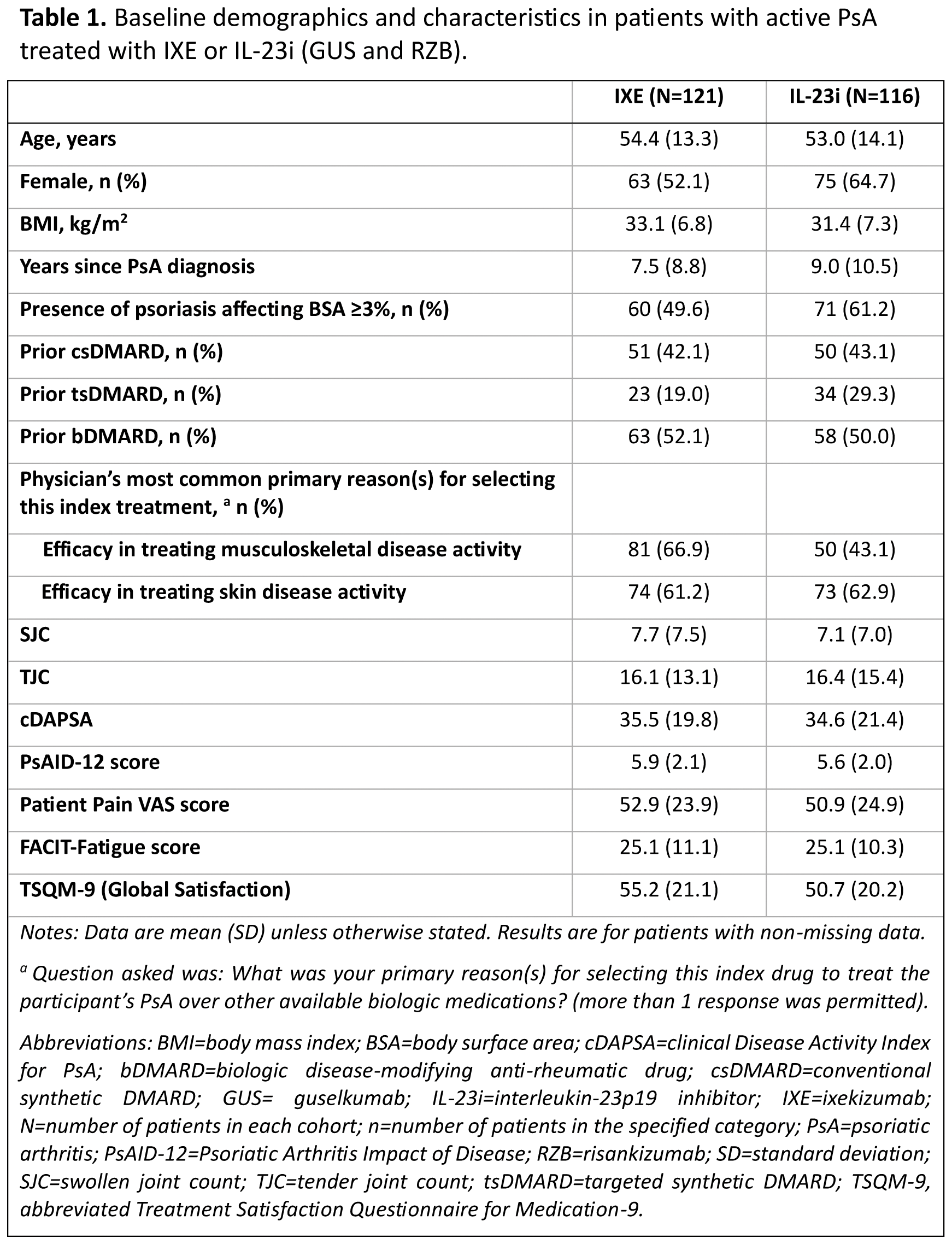 Methods: PARTUS, a prospective observational study, enrolled adult patients with active PsA (clinical Disease Activity Index for PsA [cDAPSA] >4), meeting the Classification Criteria for Psoriatic Arthritis (CASPAR). IXE or an IL-23i (guselkumab [GUS] or risankizumab [RZB]) was initiated in accordance with the Food and Drug Administration (FDA) labelling in a US clinical setting. The primary objective was to assess the RW effectiveness in patients with PsA treated with IXE as measured by the change from baseline in cDAPSA at W12. The study was not powered for comparative analysis, therefore only descriptive results are presented for IXE and IL-23i. At baseline, demographics, clinical or disease severity measures, medical history, and medication use history were collected. Clinical and patient-reported outcomes were measured at baseline, W4, and W12. Among the clinical outcomes, disease activity (as measured by the cDAPSA), remission of disease activity (measured by the proportion of patients achieving cDAPSA ≤4), low disease activity (measured by the proportion of patients achieving cDAPSA ≤13, in patients with cDAPSA score >13 at baseline), and the body surface area (BSA) affected by psoriasis (measured by the proportion of patients who achieved a BSA score <3%, in patients with BSA ≥3% at baseline) were evaluated at W4 and W12. Among the patient-reported outcomes, health-related quality of life (measured by the Psoriatic Arthritis Impact of Disease [PsAID-12] score), pain (measured by the change from baseline in Patient Pain visual analogue scale [VAS] score in patients with baseline pain >0), fatigue (measured by a ≥4 score increase from baseline in the Functional Assessment of Chronic Illness Therapy-Fatigue [FACIT-Fatigue] score), and the global treatment satisfaction (measured by the absolute score of the abbreviated Treatment Satisfaction Questionnaire for Medication-9 [TSQM-9]) were evaluated at W4 and W12. Mean and standard deviations (SD) are reported for continuous variables, while counts and percentages are reported for categorical variables.