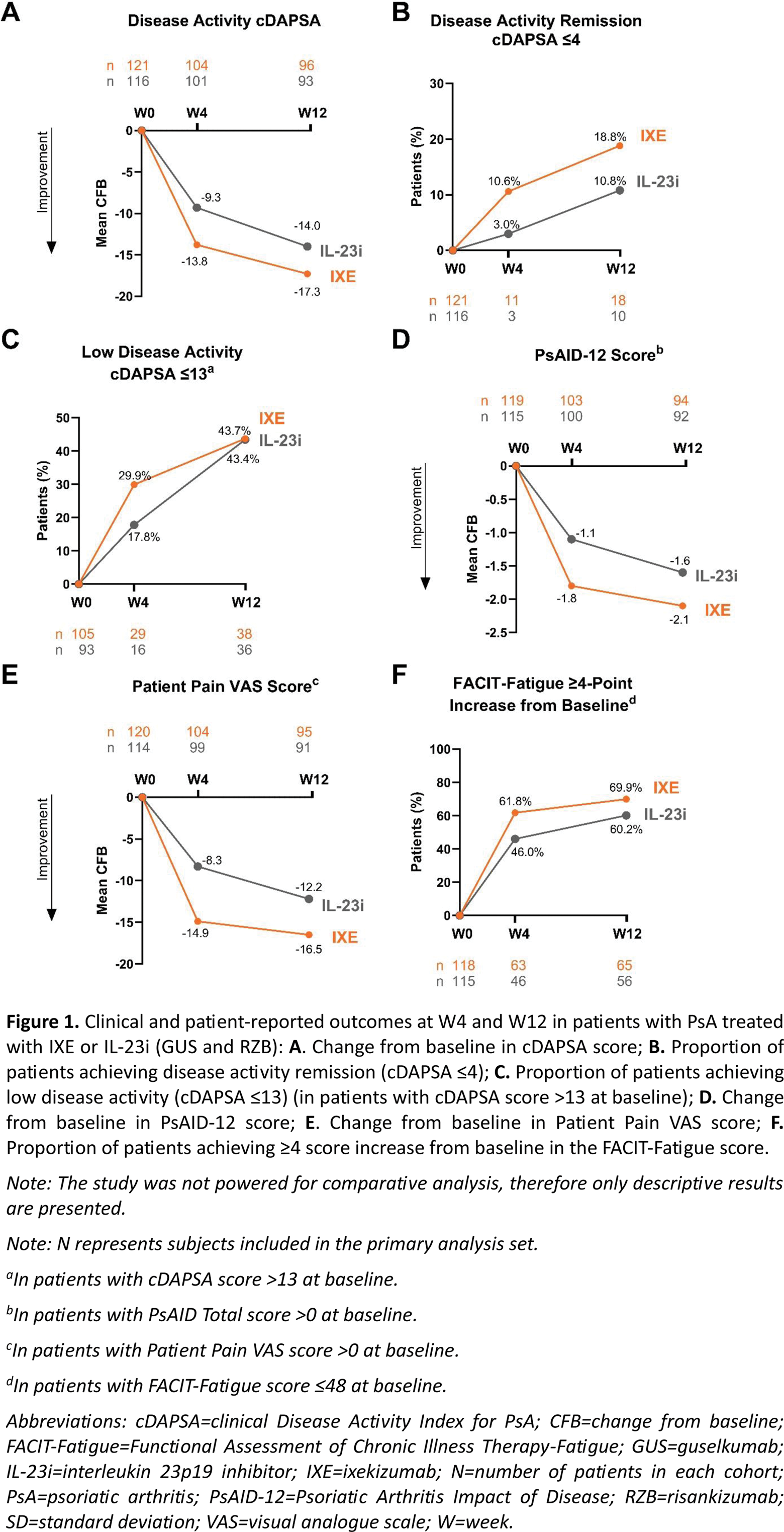 Results: Overall, 121 patients in the IXE cohort and 116 patients in the IL-23i cohort were included in this analysis. Baseline characteristics were similar between the two cohorts of patients (Table 1). Efficacy in treating musculoskeletal disease activity was among the physician’s most common primary reasons for choosing IXE (66.9%), while efficacy in treating skin disease activity was the most common reason for choosing IL-23i (62.9%). At W4, the mean (SD) change from baseline in the cDAPSA score was -13.8 (15.9) in the IXE cohort and -9.3 (15.4) in the IL-23i cohort. At W12, the mean (SD) change from baseline in the cDAPSA score was -17.3 (19.6) in the IXE cohort and -14.0 (19.3) in the IL-23i cohort (Figure 1A). At W4, the proportion of patients achieving remission of disease activity (cDAPSA ≤4) and low disease activity (cDAPSA ≤13) were 10.6% (n/Nx=11/104) and 29.9% (n/Nx=29/97) in the IXE cohort and 3.0% (n/Nx=3/101) and 17.8% (n/Nx=16/90) in the IL-23i cohort, respectively. These proportions increased through W12 in both cohorts of patients (Figure 1B, 1C). At W4, in patients with BSA ≥3% at baseline, the proportion of patients who achieved a BSA score <3% was 47.1% (n/Nx=24/51) in the IXE cohort and 27.4% (n/Nx=17/62) in the IL-23i cohort. These proportions increased by W12 in both cohorts of patients (67.4% and 57.4%, respectively). At W4, the mean (SD) change from baseline in the PsAID-12 score was -1.8 (1.9) in the IXE cohort and -1.1 (1.9) in the IL-23i cohort, with further improvements reported by W12 in both cohorts of patients (Figure 1D). Similar trends of improvements were reported for Patient Pain VAS (Figure 1E). At W4, the proportions of patients achieving clinically significant improvements in fatigue (FACIT-Fatigue ≥4-point increase from baseline) were 61.8% in the IXE cohort and 46.0% in the IL-23i cohort, with further improvements reported by W12 in both cohorts of patients (Figure 1F). In both the IXE and IL-23i cohorts, the TSQM-9 score regarding global satisfaction increased from baseline (55.2 and 50.7, respectively) to W4 (65.0 and 61.7, respectively) and remained stable at W12 (63.9 and 60.1, respectively).