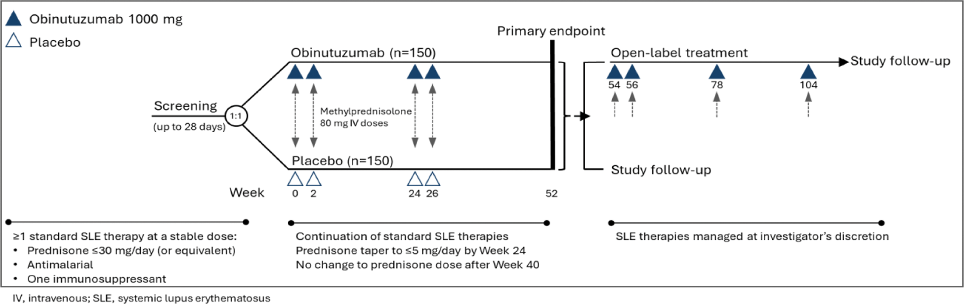 Methods: Participants with SLE (per 2019 EULAR/ACR Classification Criteria) with high disease activity (Systemic Lupus Erythematosus Disease Activity Index 2000 [SLEDAI-2K] ≥8 and British Isles Lupus Assessment Group 2004 [BILAG-2004] Category A severity in ≥1 domain and/or Category B severity in ≥2 domains), and receiving at least one standard therapy for SLE (at least one or a combination of immunosuppressants, antimalarials and glucocorticoids), were randomised 1:1 to receive blinded infusions of obinutuzumab (1000 mg) or placebo on Day 1 (Week 0) and at Weeks 2, 24 and 26 (Figure 1). After completing blinded treatment at Week 52, participants from both groups may be eligible to receive an additional 18 months of open-label treatment (OLT), in which obinutuzumab will be administered at Weeks 54, 56, 78 and 104. After completion of study infusions during the blinded stage or the OLT, participants will be followed for at least 12 months from their last infusion to monitor safety and disease activity, with no further obinutuzumab infusions. The primary endpoint is the difference between the proportions of obinutuzumab-treated versus placebo-treated patients who achieve the SLE Responder Index-4 (SRI-4) at Week 52, defined as a reduction of ≥4 points in the SLEDAI-2K, <1 new BILAG A or <2 new BILAG B items and no worsening of ≥0.3 points on a 3-point Physician’s Global Assessment-Visual Analogue Scale. Secondary endpoints include the proportions of participants who achieve BILAG-based Composite Lupus Assessment or SRI-6 at Week 52, sustained glucocorticoid control from Weeks 40 to 52 (for those having entered the study on prednisone [or equivalent] ≥10 mg/day), sustained SRI-4 response from Weeks 40 to 52 and the time to first BILAG flare over 52 weeks.