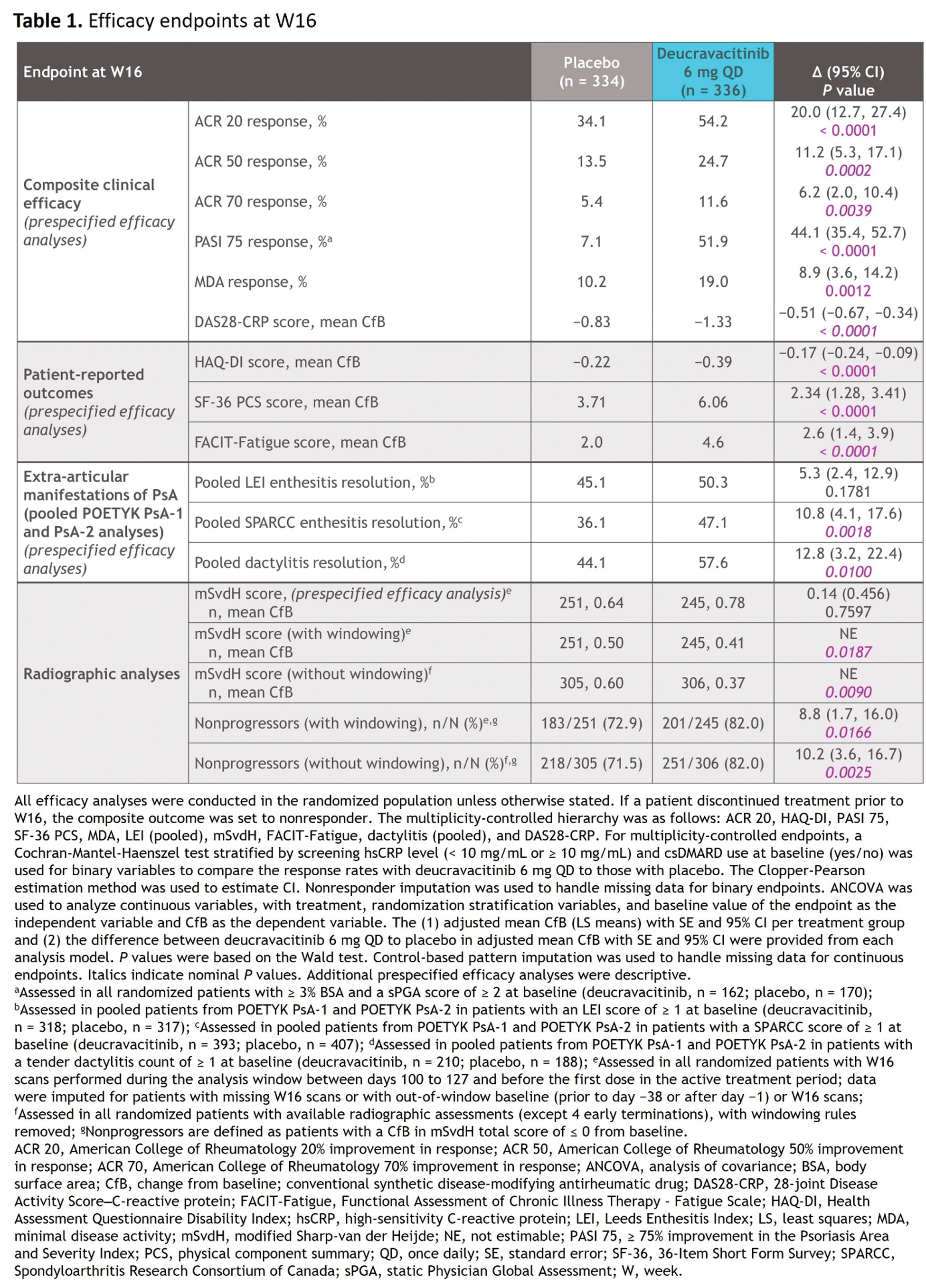 Conclusion: Treatment with deucravacitinib, the first oral TYK2 inhibitor evaluated in phase 3 studies of active PsA, resulted in superior efficacy vs placebo at W16 across multiple endpoints, including overall disease activity measures, musculoskeletal and dermatologic manifestations, and QoL in adults with active PsA who were naive to bDMARDs. Inhibition of radiographic progression was observed with deucravacitinib at W16 in post hoc analyses. Safety was consistent with the established safety profile of deucravacitinib in the phase 3 POETYK PsA-2 study, the phase 2 PsA study, and across the PsO clinical program,p [1, 2, 3, 4, 5] with no new safety signals identified. Findings demonstrate deucravacitinib efficacy in PsA and underscore its favorable safety profile.